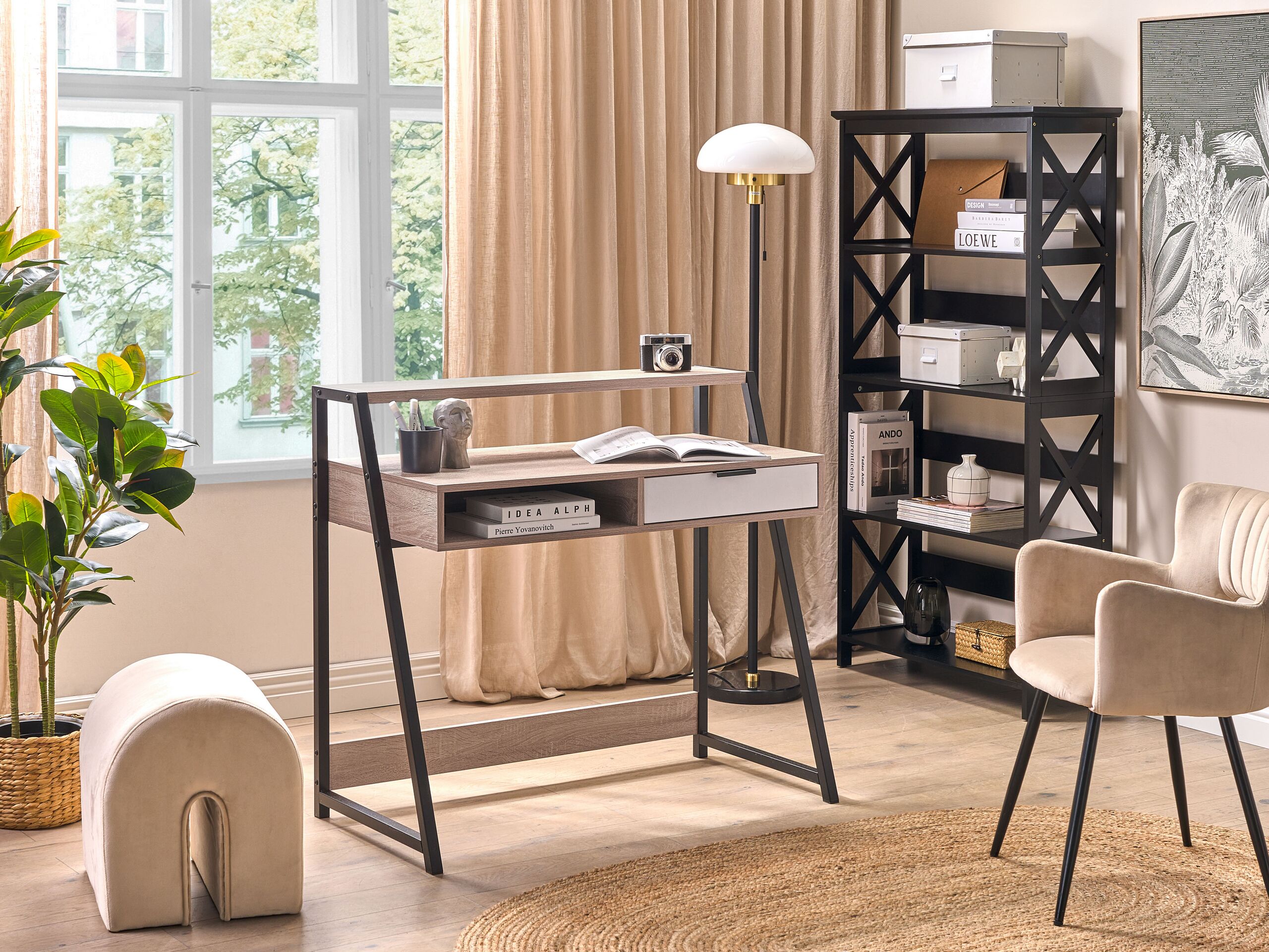 Industrielles, 2-teiliges Büro-Komplettset bestehend aus Schreibtisch und Bücherregal. Dieses stilvolle Möbelset ist die perfekte Ergänzung für jeden modernen Wohnbereich. Der Schreibtisch ist mit einer Schublade und einem offenen Stauraum unter der Tischplatte ausgestattet, damit Sie Ihren Arbeitsplatz immer aufgeräumt halten können. Die obere Ablage bietet den idealen Platz, um wichtige Notizen in Sichtweite aufzubewahren oder persönliche Dinge wie Bilder oder Grünpflanzen zu exponieren. Das Gestell aus pulverbeschichtetem Metall verleiht dem Schreibtisch einen geradlinigen Stil, der gut zu dem schwarz lackierten Bücherregal mit seinen breiten, offenen Fächern passt. Da es sich bei dem Set um einzelne Möbelstücke handelt können Sie diese auf vielfältige Weise in Ihrem Wohnraum plazieren oder sie auch in verschiedenen Räumen aufstellen.