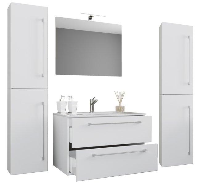 Das Badmöbel-Set besteht aus einem Unterschrank mit zwei Schubladen auf robusten Metallschienen.