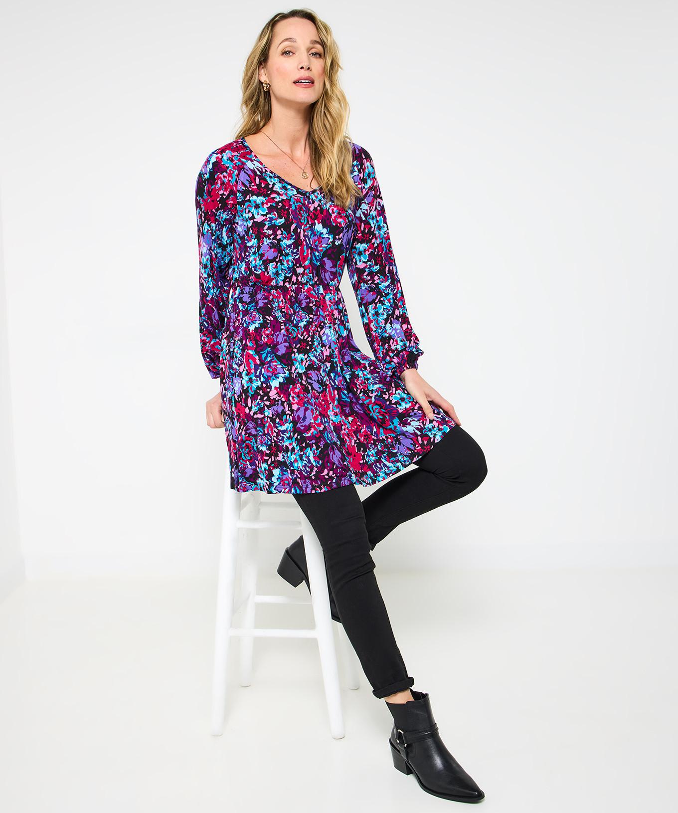 Diese Winter-Jersey-Tunika mit lebhaftem Blumenmuster ist eine vielseitige Ergänzung für jede Garderobe. Der V-Ausschnitt und die langen Ärmel bieten eine bequeme und stilvolle Passform, die für verschiedene Anlässe geeignet ist.