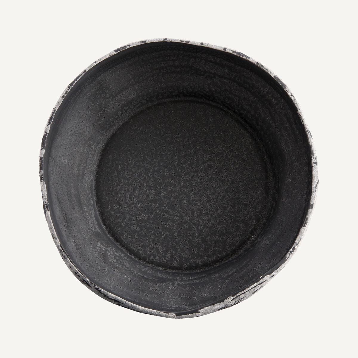 Aus mattschwarzer Keramik. Eine matte weisse Emaille wird teilweise auf den Rand der Schale aufgetragen