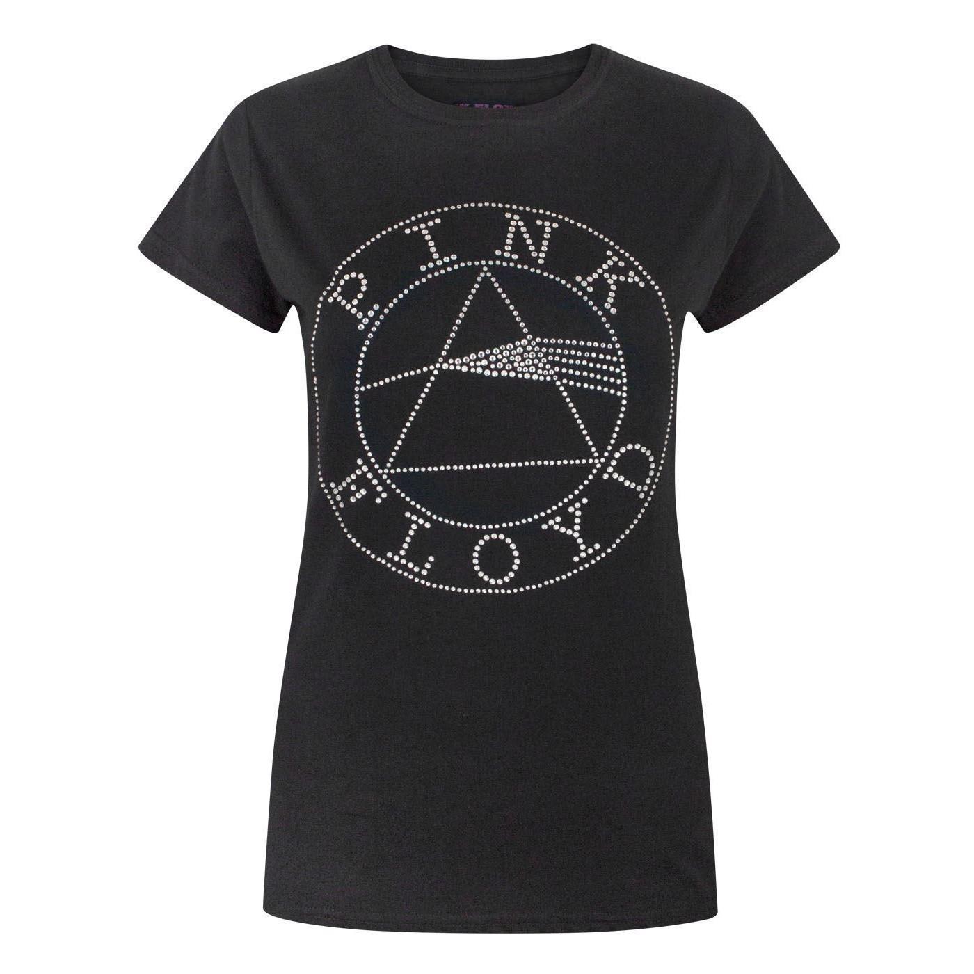 Dieses T-Shirt verfügt über einen klassischen Rundhalsausschnitt und kurze Ärmel und bietet eine bequeme und vielseitige Passform. Die Vorderseite ist mit einer auffälligen, mit Strasssteinen verzierten Grafik versehen, die das ikonische Albumcover "Dark Side Of The Moon" zeigt.