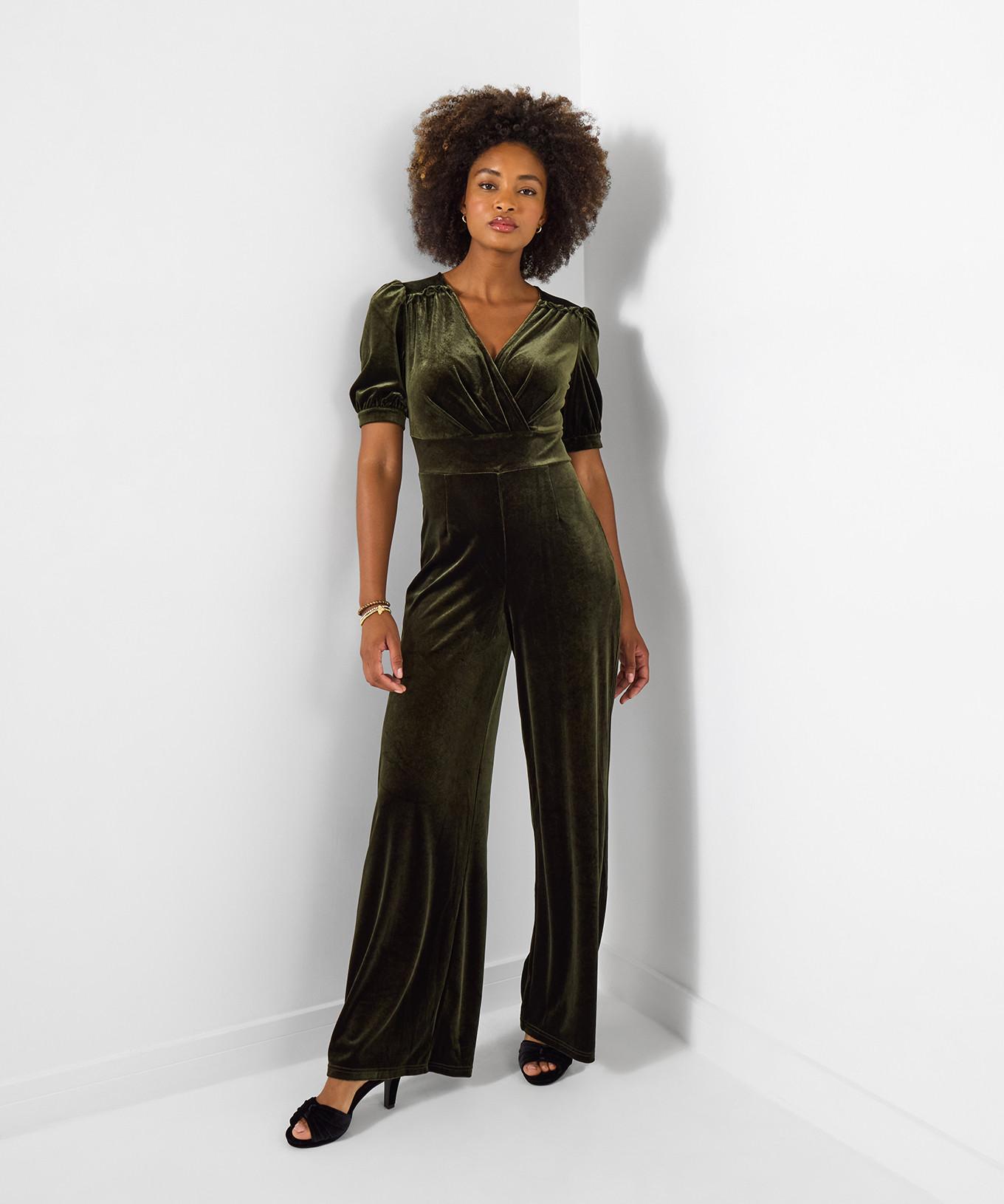 Dieser elegante Velours-Jumpsuit verfügt über einen schmeichelhaften V-Ausschnitt und kurze Puffärmel, die eine raffinierte Silhouette schaffen. Das gerade Bein-Design bietet einen zeitlosen und schicken Look, der für verschiedene Anlässe geeignet ist.
