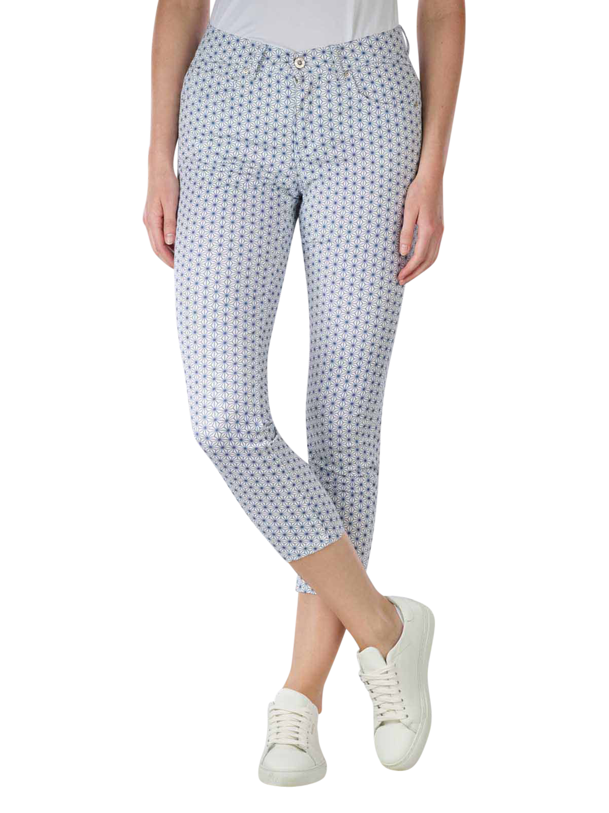 Die Ornella 5-Pocket Slim Fit Graphic Print Hose ist mit ihrem grafischen Druck ein modisches Highlight. Durch den leichten Stoff und das Bein im Ankle-Schnitt ist sie eine ausgezeichnete Wahl für wärmeres Wetter. Der mittelhohe Bund und das schmale Bein zaubern eine schöne Silhouette.