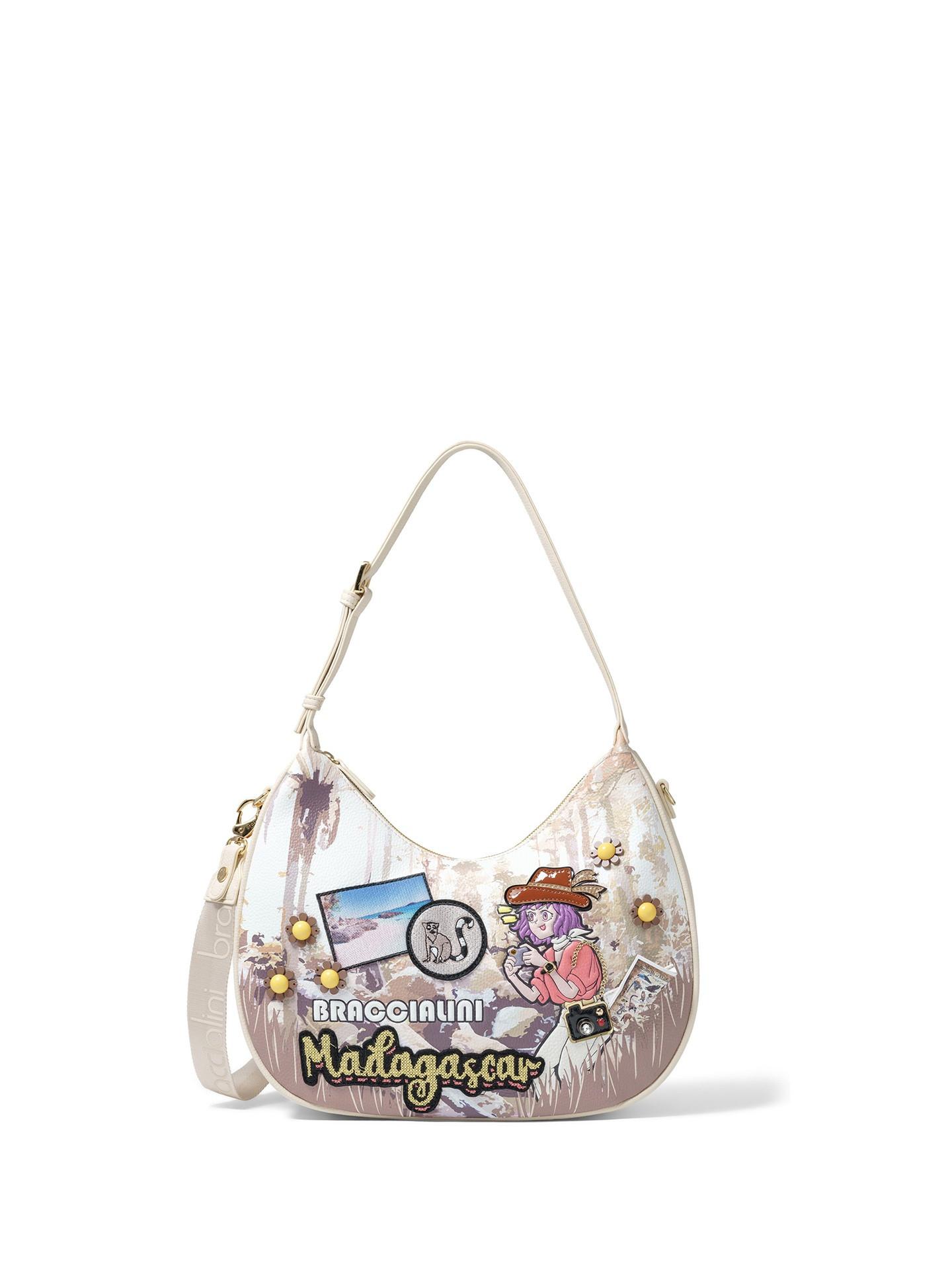 Die Umhängetasche Eterea Plus präsentiert ein einzigartiges Design im Madagaskar-Stil, das künstlerische Elemente mit praktischer Funktionalität verbindet. Die Tasche ist mit verspielten Patches und Nieten verziert, die ihr eine unverwechselbare Ästhetik verleihen. Ihre geschwungene Silhouette und der verstellbare Riemen machen sie zu einem vielseitigen Accessoire für verschiedene Anlässe.