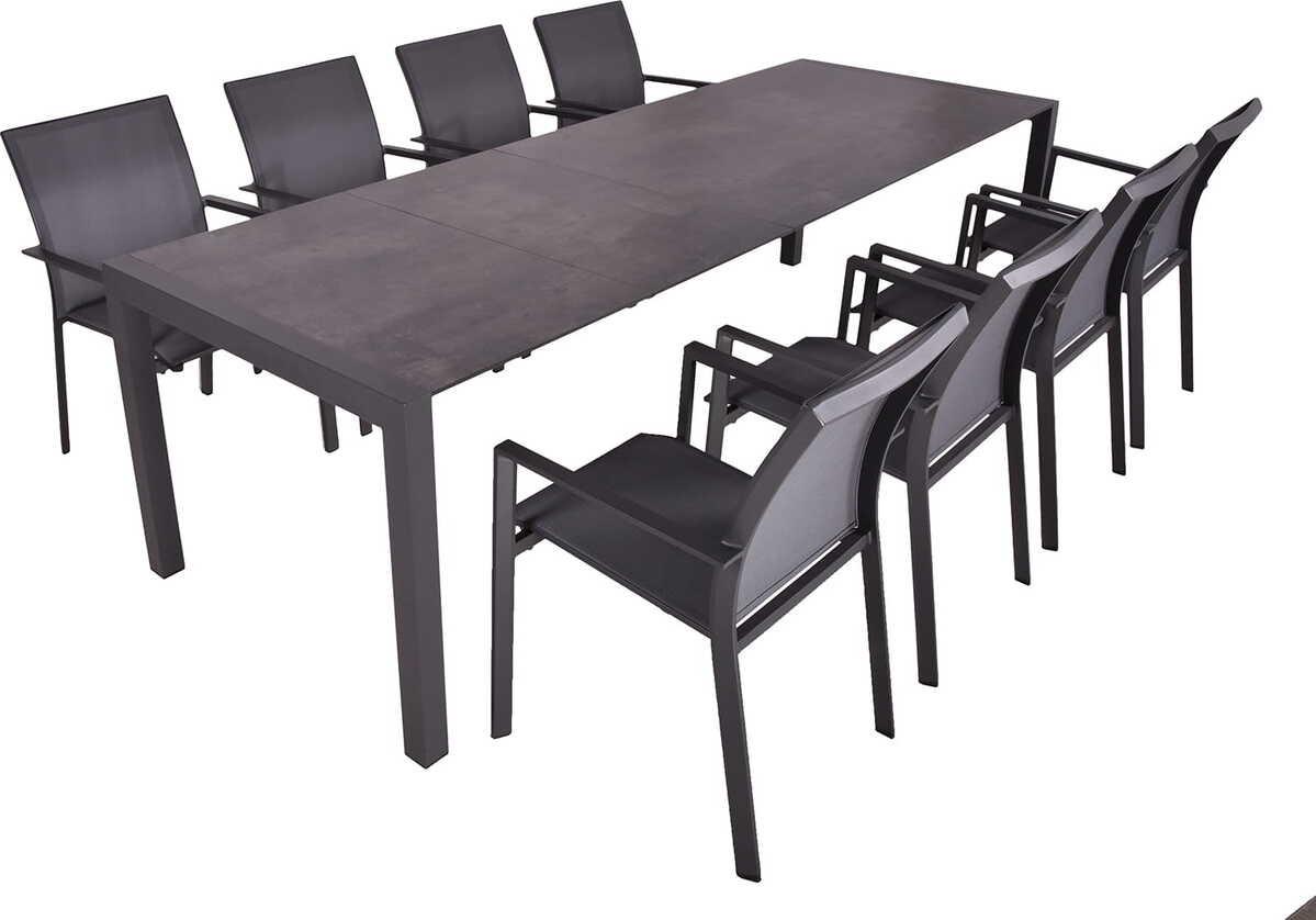 Die Tischgruppe Sophia, eine Fusion aus Eleganz und Praktikabilität, kreiert einen beeindruckenden Outdoor-Essbereich. Dieses Set, bestehend aus einem robusten, pfefferschwarzen Aluminium-Ausziehtisch Sophia und acht Stapelstühlen Rana, verbindet modernes Design und Langlebigkeit zu einer stilvollen und komfortablen Sitzlösung für Ihre Outdoor-Mahlzeiten. Die dunkelbraune Kunststoff HPL-Tischplatte in Grau ist ebenso dauerhaft wie pflegeleicht, während die Stühle aus dunkelgrauem, pulverbeschichtetem Aluminium mit strapazierfähigem Kunststoffgewebe 2x2 in Mittelgrau bespannt sind.