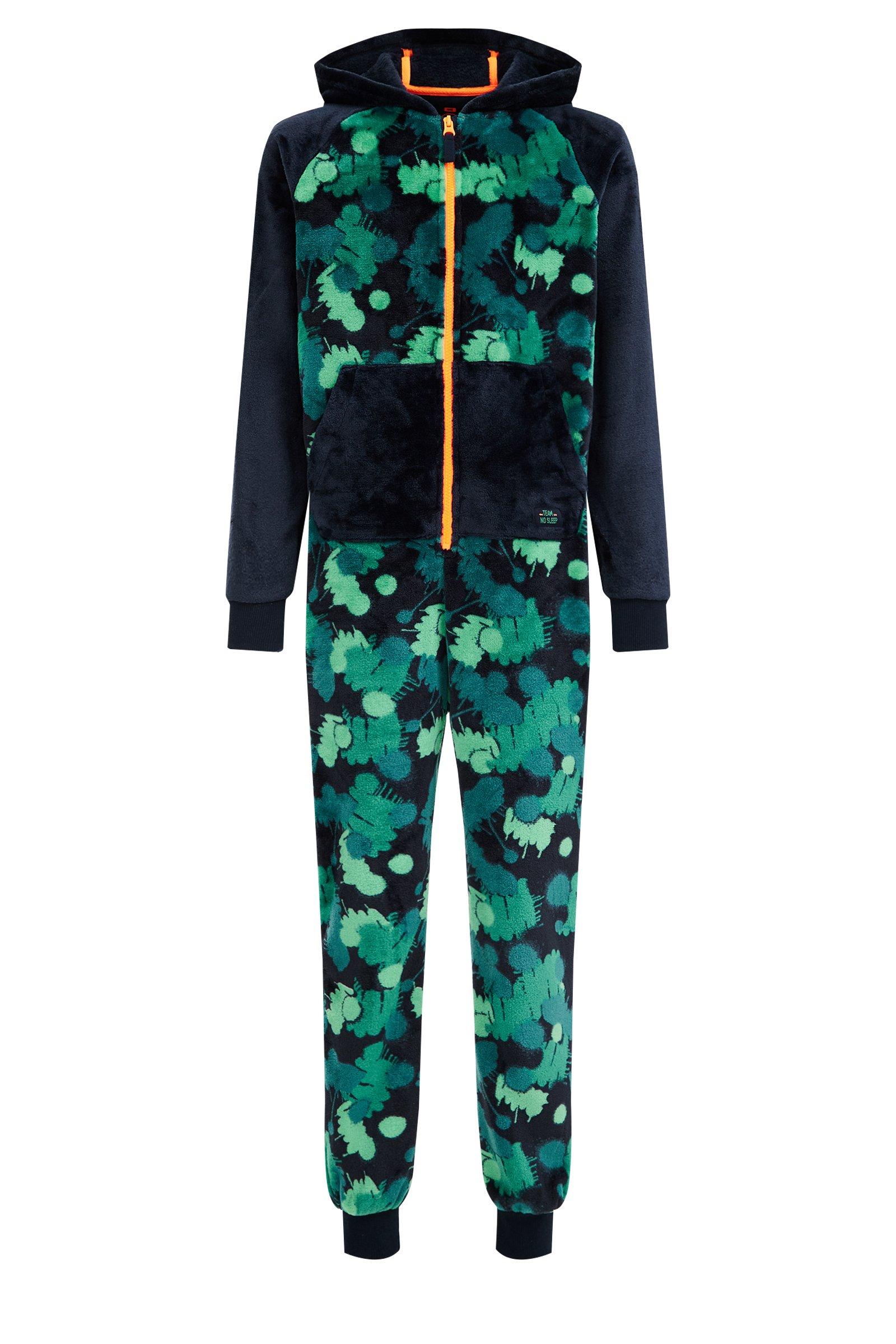 Normal geschnittener Fleece-Anzug mit Muster. Ausgestattet mit Kapuze, Reißverschluss, langen Ärmeln, zwei Eingrifftaschen auf der Vorderseite und schmalem Hosenbein.