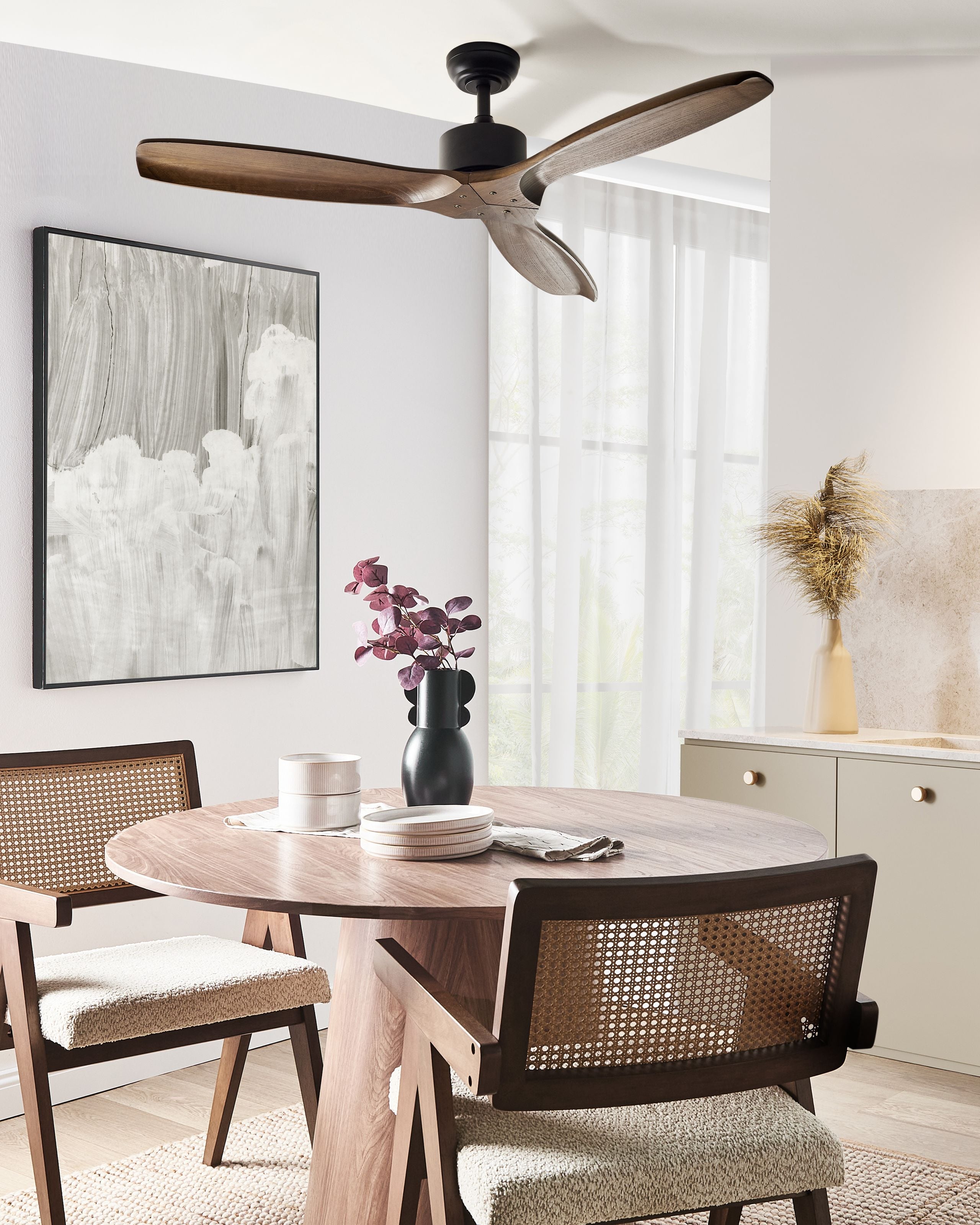 Deckenventilator im rustikalen Stil mit Fernbedienung. Dieser rustikale Deckenventilator ist die ideale Ergänzung für jedes Schlafzimmer oder Wohnzimmer. Mit seinem robusten Metallgehäuse und den eleganten Holzflügeln verleiht er Ihrem Zuhause eine warme, natürliche Note. Das Gerät verfügt zwar nicht über eine integrierte Beleuchtung, aber dank der einstellbaren Geschwindigkeitsstufen lässt sich der Luftstrom ganz nach Ihren Bedürfnissen regulieren für ein angenehmes Raumklima zu jeder Zeit. Die mitgelieferte Fernbedienung ermöglicht eine bequeme Steuerung aller Funktionen von überall im Raum. Ein integrierter Timer sorgt zusätzlich für eine sorgenfreie und komfortable Nutzung.