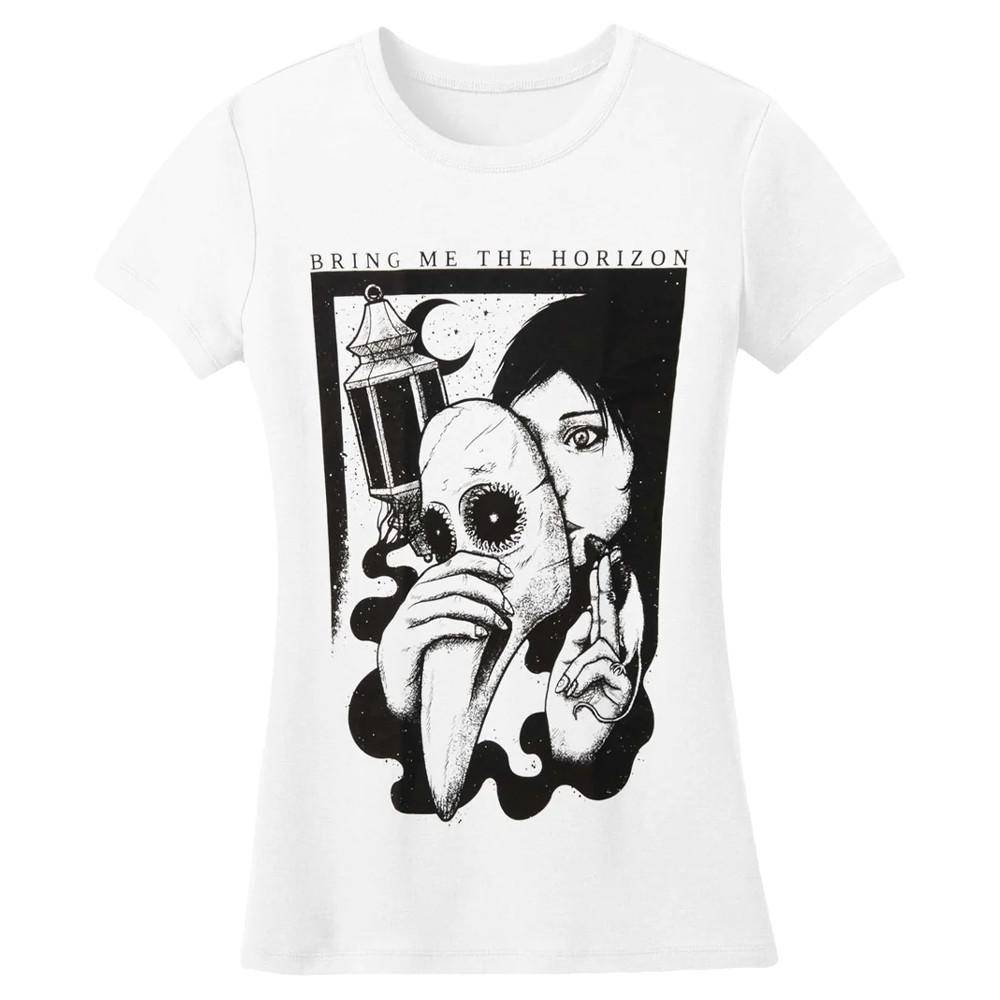 Dieses T-Shirt verfügt über einen einzigartigen Grafikdruck, der es zu einer unverwechselbaren Ergänzung jeder Garderobe macht. Das Design zeigt eine Figur, die eine Pestdoktormaske und eine Laterne hält, vor einem dunklen, atmosphärischen Hintergrund. Der Bandname „BRING ME THE HORIZON“ ist prominent über der Grafik platziert.