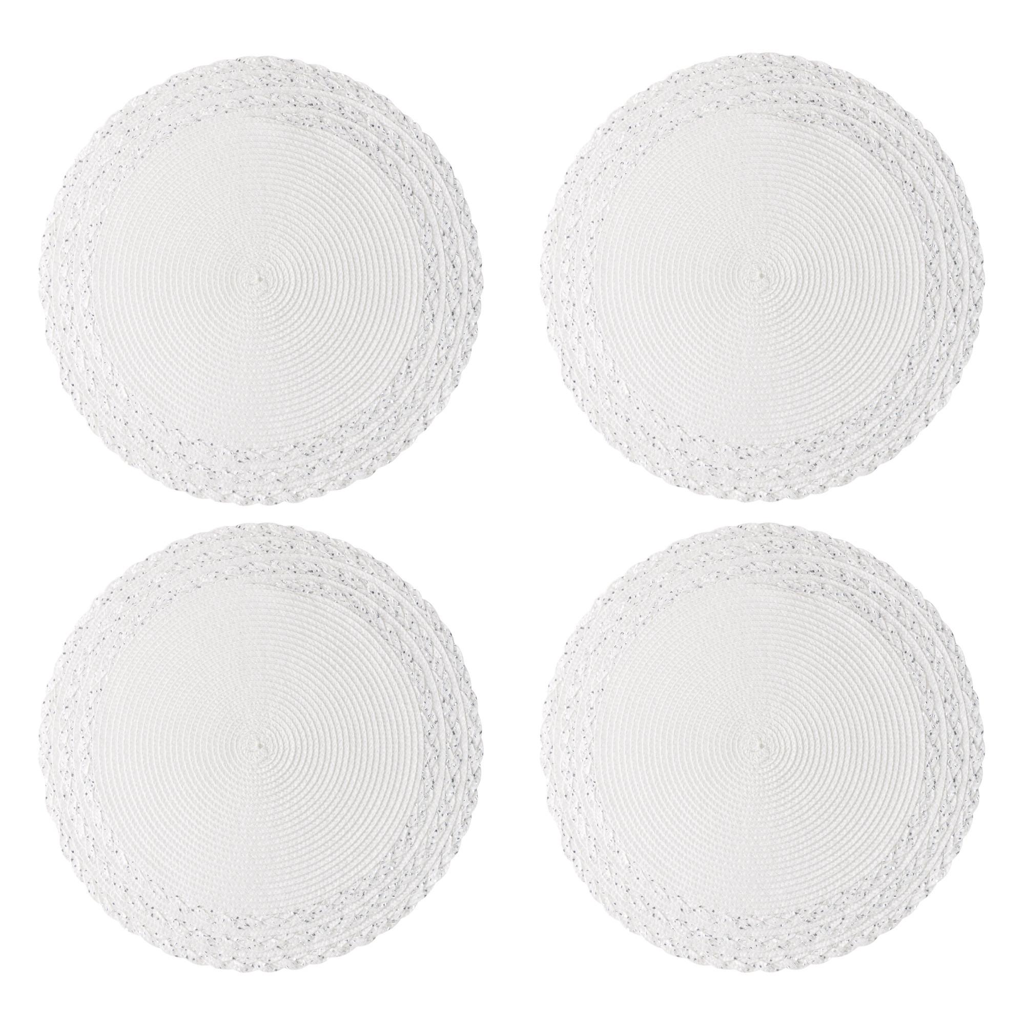 Satz von 4 weißen PP-Platzsets mit einer Größe von 38 cm. Genau das richtige Accessoire für Ihren Tisch im Innen- und Außenbereich. Dank seiner neutralen Farbe ist es ein Muss, denn das Set passt zu allen Einrichtungsstilen, Stilen und Jahreszeiten. Leicht zu reinigen und aufzubewahren.