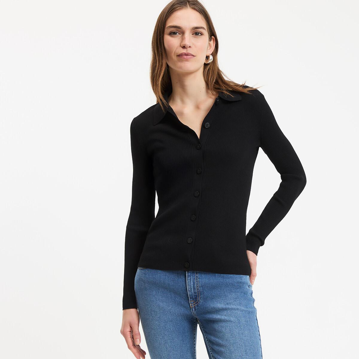 Dieser langärmelige Cardigan ist aus einem weich fliessenden, gerippten Viskosestrick gefertigt und verfügt über einen Polokragen sowie einen Knopfverschluss vorne. Sein vielseitiges Design macht ihn zu einer raffinierten Ergänzung für jede Garderobe.