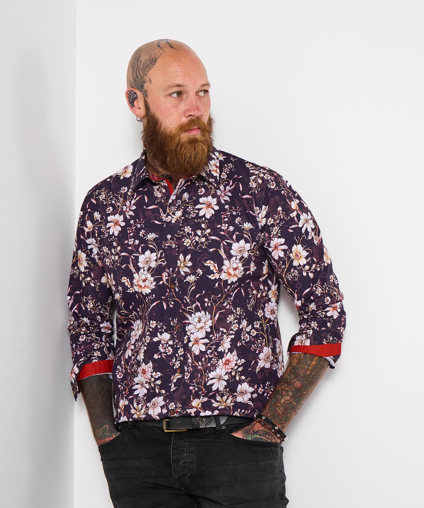 Dieses florale Langarmhemd präsentiert ein lebendiges Blumenmuster, das einen unverwechselbaren und stilvollen Look bietet. Das Hemd ist mit einem klassischen Kragen und einer durchgehenden Knopfleiste ausgestattet, was für ein gepflegtes Erscheinungsbild sorgt. Ein auffälliger Kontrastbesatz am Innenkragen und an den Manschetten verleiht dem traditionellen Design einen modernen Touch.