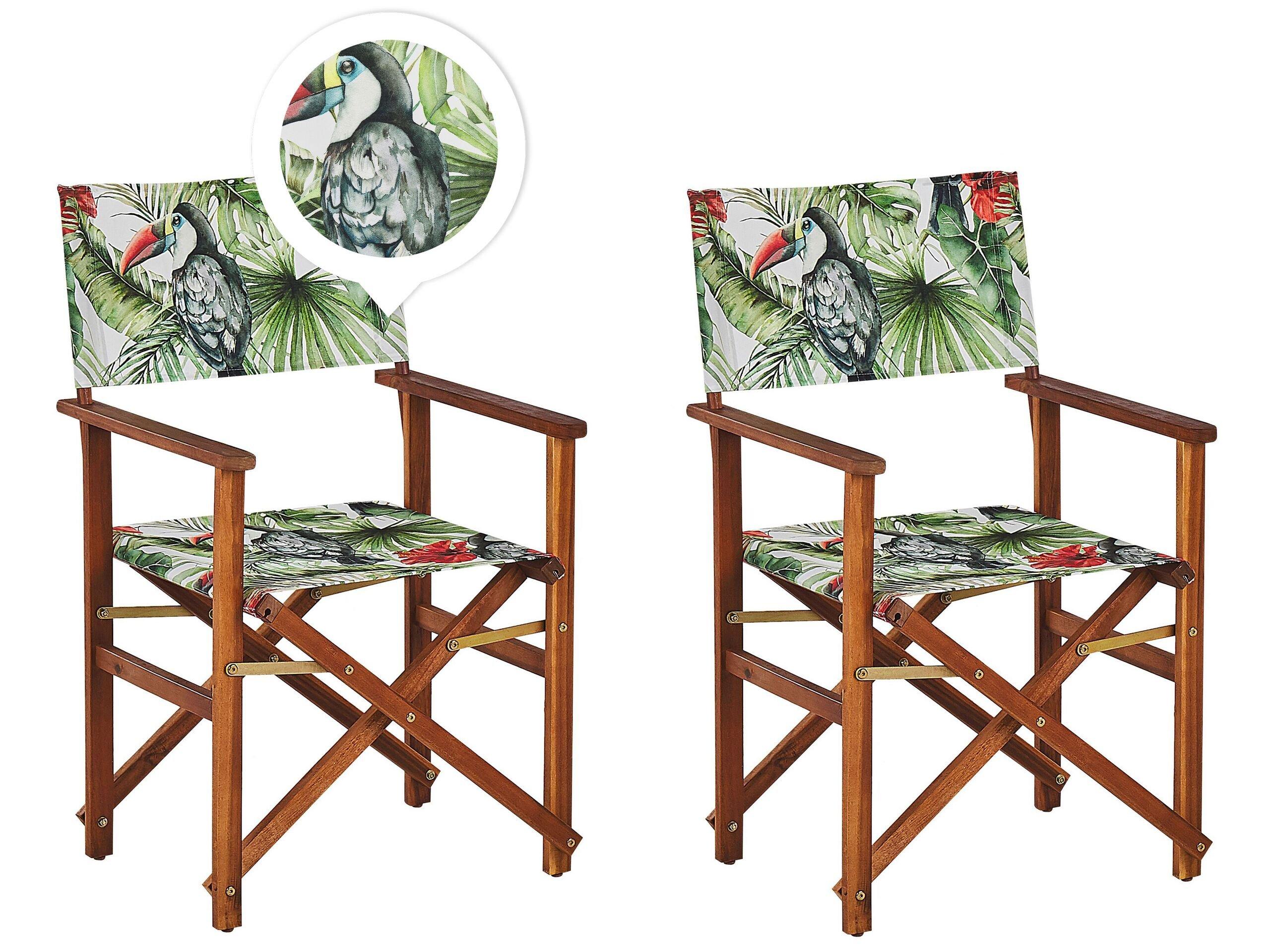 Outdoor-Regiestühle aus Holz mit 2 wechselbaren Stoffbezügen mit Vogelmotiv. Ob im Wohnzimmer oder im Garten platziert – dieses Set wird Ihrem Zuhause garantiert ein Hollywood-Feeling verleihen. Das Gestell ist aus langlebigem und robustem Akazienholz in naturbelassener Ausführung gefertigt, welches den zeitlosen Stil unterstreicht. Im Lieferumfang sind zwei Regiestühle mit jeweils einem Standardbezug in Grau, sowie 2 zusätzliche farbenfrohe Alternativstoffe mit Tukanmotiv enthalten. So haben Sie die Möglichkeit, die Sitzgelegenheiten nach Belieben zu verändern und für Abwechslung zu sorgen. Wenn Sie die Stühle Mal nicht brauchen, können Sie sie leicht zusammenklappen und so Platz sparen.