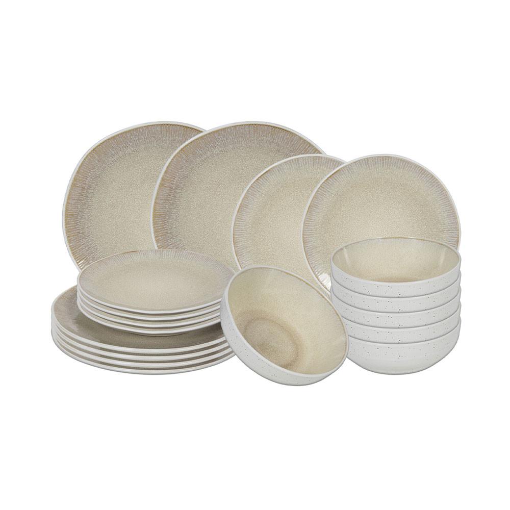 Bringe Eleganz und Stil auf deinen Esstisch mit dem Tavola Geschirrset Tzia. Das moderne, elegante Design in Beige und Weiss passt perfekt zu jeder Tischdekoration und sorgt für eine einladende Atmosphäre. Gefertigt aus hochwertiger Keramik, überzeugt das Set nicht nur optisch, sondern auch durch seine Robustheit. Es ist spülmaschinen- und mikrowellengeeignet, sodass du es ganz unkompliziert im Alltag nutzen kannst. Die Kombination aus stilvollem Design und hoher Funktionalität macht dieses Set zum perfekten Begleiter für jede Mahlzeit ob für den täglichen Gebrauch oder besondere Anlässe., , , Produktinformation, , Material: Keramik, Spülmaschinenfest: ja, Geschirr für 6 Personen, , Lieferumfang, , 6 Speiseteller, 6 Schalen, 6 Dessertteller
