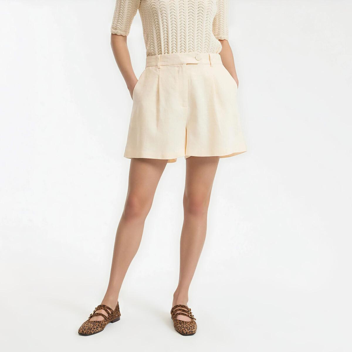 Diese weichen Leinenshorts verfügen über Bundfalten und einen Knopfriegel am Bund. Der Bund ist mit Gürtelschlaufen, Knopf und Reissverschluss ausgestattet und hinten elastisch. Schräge Einschubtaschen runden das Design ab.