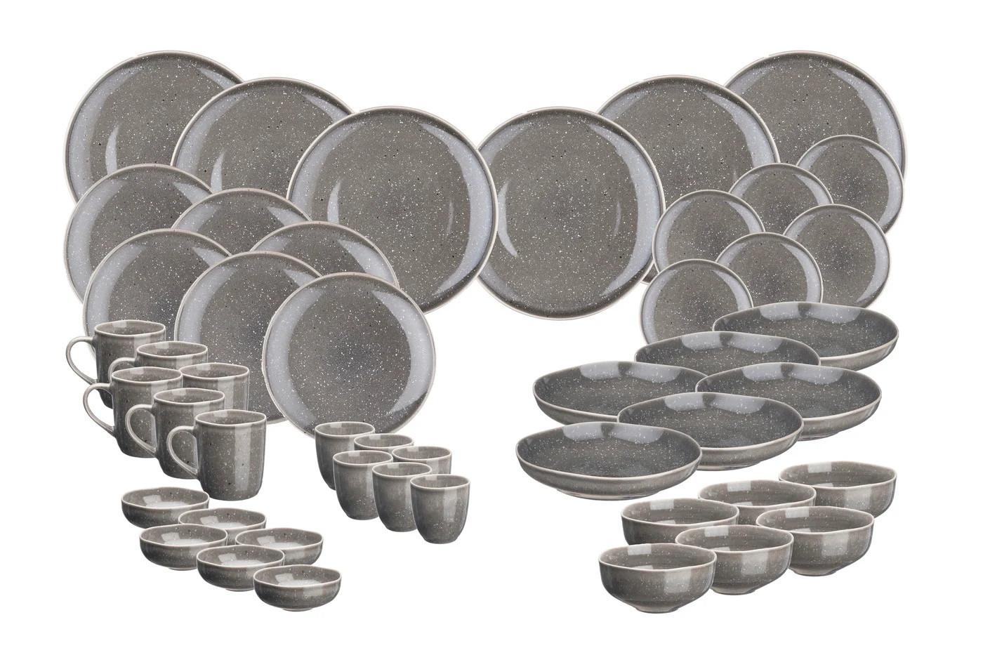 Das komplette Set umfasst alle Geschirrstücke der Kollektion für den täglichen Gebrauch. Das Set besteht aus 18 Tellern in drei verschiedenen Grössen, 6 Suppentellern, 12 Schüsseln in zwei verschiedenen Grössen, 6 Tassen und 6 Untertassen für eine vollständige Tischgestaltung für 6 Personen. Was die Herstellung betrifft, werden nach einem ersten Brennvorgang des Tons bei niedriger Temperatur reaktive Glasuren in verschiedenen Farben auf das Steingut aufgetragen und verleihen ihm eine einzigartige und galaktische Reliefstruktur. Die Erscheinung von Farbnuancen von einem Stück zum anderen ist das Ergebnis einer geschickten Mischung aus Brenntechniken und der Art und Weise, wie die Glasur aufgetragen wird. Die STELLAR Kollektion zeichnet sich durch ihre kosmische Eleganz aus. Mit ihrem raumgreifen Anthrazitgrau hat sie eine kraftvolle reaktive Wirkung, die an eine Nebel erinnert und Sie dank einer reaktiven Glasur auf eine zeitlose Reise mitnimmt, indem sie ein Sternenlicht auf Ihrem Tisch erzeugt. Gestalten Sie Ihr Universum und decken Sie einen Tisch so schön wie einen Stern. Enthält: 6 Teller Ø27cm + 6 Teller Ø22cm + 6 Teller Ø18cm + 6 Suppenteller Ø22,5cm + 6 Schüsseln Ø11,5cm + 6 Schüsseln Ø14cm + 6 Tassen 40cl + 6 Untertassen 15cl