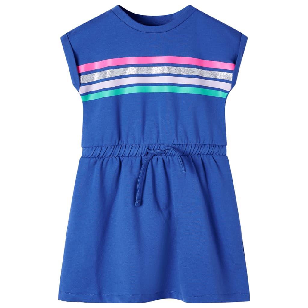 Dieses Kinderkleid hat einen Rundhalsausschnitt, kurze Ärmel mit eingenähten Aufschlägen und einen Kordelzug am Bund. Das Mädchenkleid ist auf der Brust mit Streifen in verschiedenen Farben bedruckt. Das kurze Kleid ist aus weichem Material gefertigt, das zu 95 % aus Baumwolle und zu 5 % aus Elastan besteht und daher nicht nur komfortabel, sondern auch atmungsaktiv ist.