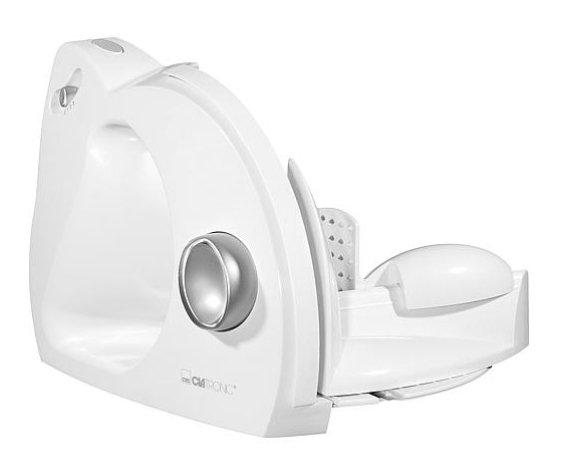 Gehäuse Kunststoff mit Edelstahlmesser Ø 170mm, Restehalter mit Fingerschutz, 3-Stufenschaltung mit Sicherheits-Einschalttaster, stufenlos einstellbarer Schnittstärke, abnehmbarem Schlitten und klappbarem Gehäuse
