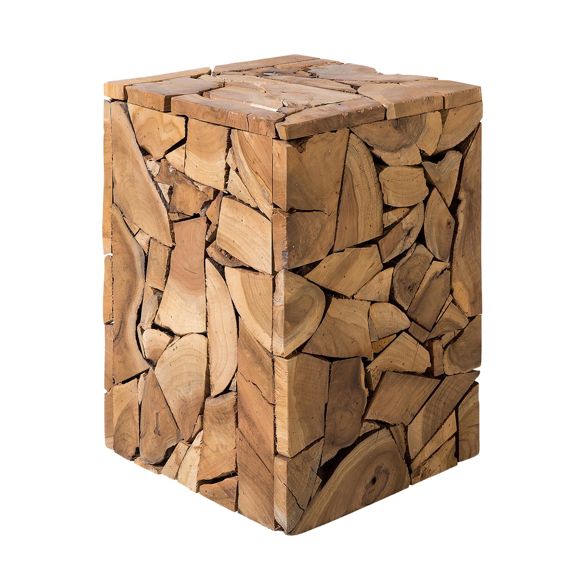 Multifunktionaler Beistelltisch aus Teak Holz. Praktisch, vielseitig und multifunktional lässt sich der Tisch in vielen Wohnbereichen einsetzen: neben Couch oder Sessel als handlicher Beistelltisch, einzeln oder auch zu Zweit oder Dritt nebeneinander als robuster Couchtisch, in der Diele wird er zu einer nützlichen Ablage, mit einem Kissen darauf verwandelt er sich zum Hocker und wird zu einer stabilen Sitzgelegenheit, als Nachttisch sorgt er für eine rustikale Ausstrahlung. Dieses charaktervolle Wohnaccessoire ist aus unterschiedlichen, kleinen Holzstückchen aus Teak Holz zusammengesetzt und wirkt wie ein gepresster Würfel. Die individuelle Struktur und die warmen Brauntöne strahlen Gemütlichkeit und Ruhe aus.