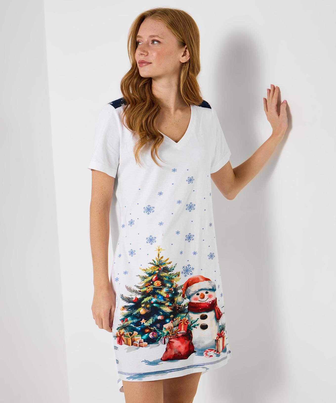 Dieses festliche Jersey-Nachthemd mit charmantem Schneemann- und Weihnachtsbaumdruck ist perfekt für gemütliche Feiertage. Der weiche Stoff sorgt für ein angenehmes Gefühl auf der Haut und ist ideal für entspannte Abende.