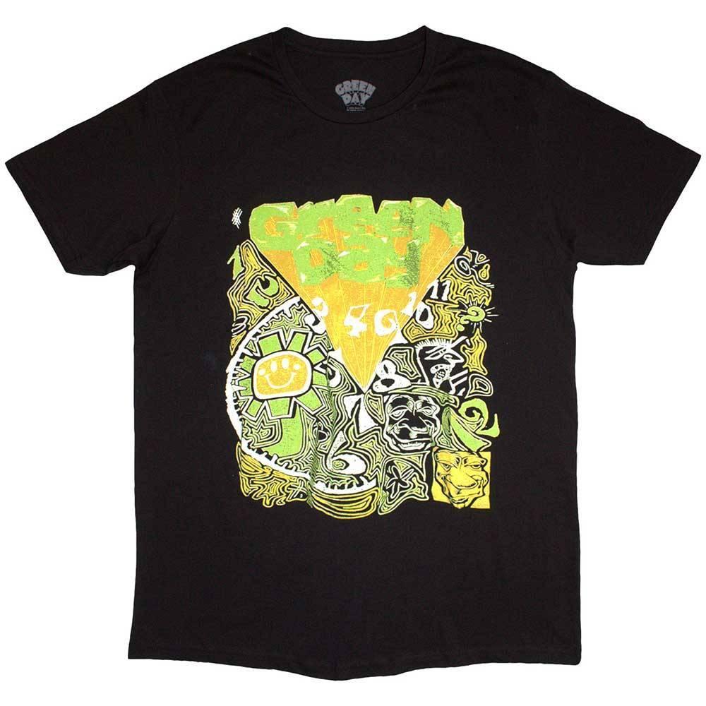 Dieses T-Shirt zeigt einen einzigartigen Grafikdruck auf der Vorderseite mit einem abstrakten Design in leuchtenden Grün- und Gelbtönen. Die Rückseite des Shirts zeigt das ikonische Green Day-Logo in einem ähnlichen künstlerischen Stil.