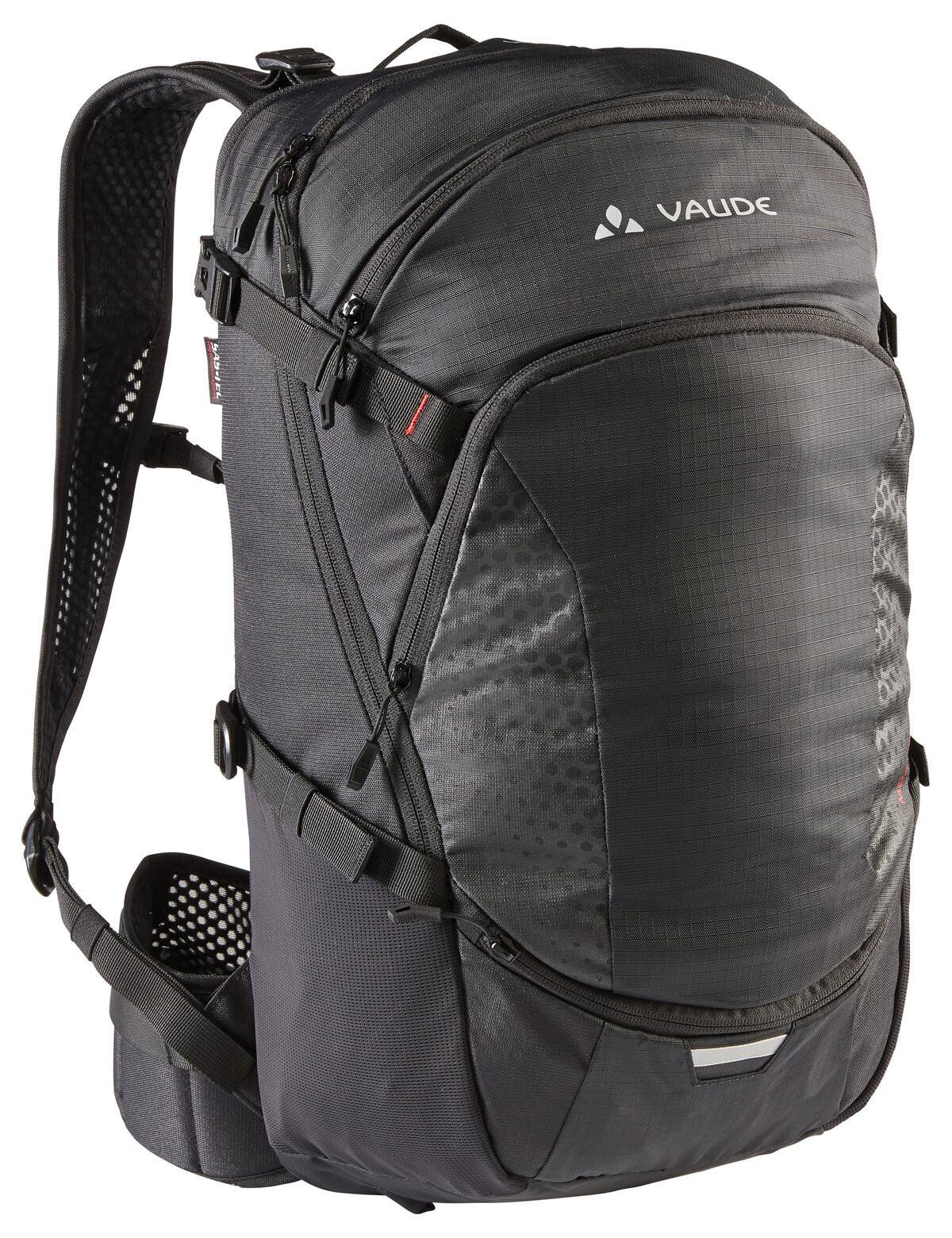 Dieser flexible Fahrrad Rucksack meistert jede Alpenüberquerung und jeden noch so schwierigen Trail bergauf und bergab sicher. Der mehrschlagfähige Protektor von SAS-TEC SCA 500 ist in das ergonomische Körperkontakt-Rückensystem integriert und lässt sich leicht über den um 6 cm höhenverstellbaren Hüftgurt optimal auf die Körpergröße bzw. Rückenlänge anpassen. Für festen Sitz in ruppigem Gelände sorgen die leichten Schultergurte im Verbund mit dem luftdurchlässigen, voll umschließenden Hüftgurt mit seitlichem Verschluss. Das große, aufgesetzte Frontfach hält zahlreiche Taschen zur Organisation von Werkzeug, Ersatzschlauch und Pumpe bereit. Im oberen Frontfach lassen sich Geldbeutel und Schlüssel sicher in der innenliegenden Netztasche verstauen. Weitere Netztaschen befinden sich seitlich und auf dem rechten Hüftflügel. Eine flexible Helmhalterung, mit der sich auch Full Face Helme transportieren lassen, sowie eine abnehmbare Regenhülle sind inklusive. Beide lassen sich im Bodenfach verstauen. Für den großen Durst kann das Trinkblasenfach 2 3 l aufnehmen. Zur weiteren Ausstattung gehören: ein verstellbarer Brustgurt mit Trinkschlauchhalter, Schlüsselhalter, Blinklichthalter, Brillenhalter, seitliche Kompressionsriemen und reflektierende Elemente. Das abrieb- und reißfeste Ripstopmaterial wurde nach dem strengen ökologischen Standard umweltfreundlich hergestellt und ist mit Eco Finish PFC-frei wasserabweisend ausgerüstet. Das GS-Zeichen steht für Geprüfte Sicherheit nach CE Norm EN 1621-2 durch den TÜV SÜD. Das VAUDE Green Shape-Label steht für ein umweltfreundliches, funktionelles Produkt aus nachhaltigen und zertifizierten Materialien.