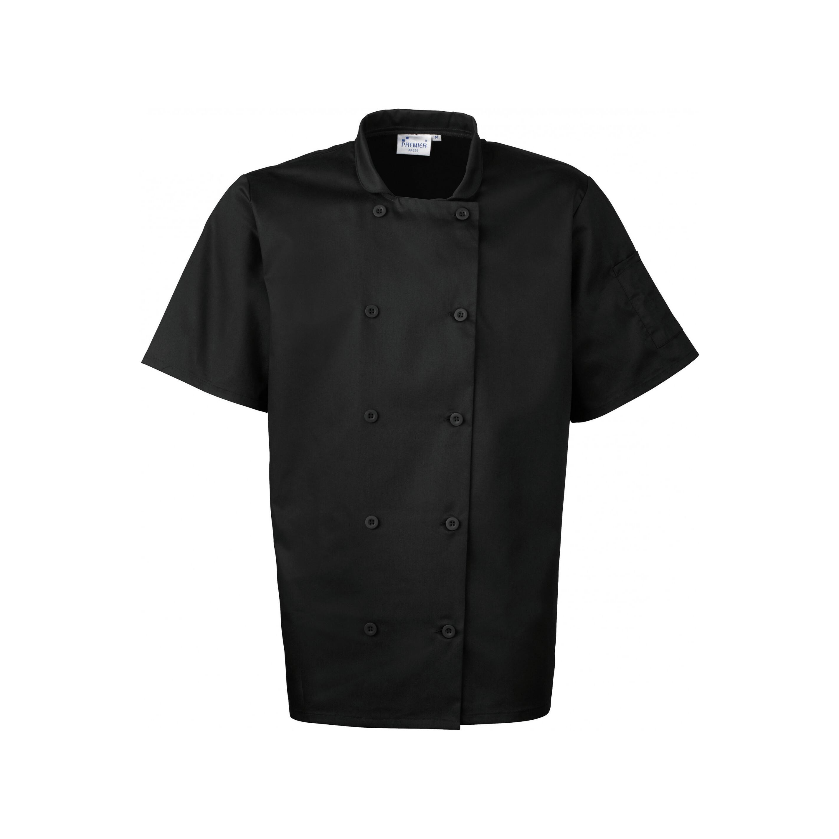 Diese Kochjacke ist für den professionellen Einsatz konzipiert und bietet sowohl Komfort als auch ein klassisches Erscheinungsbild. Sie verfügt über eine zweireihige Vorderseite mit Knopfverschlüssen, die einen traditionellen Kochuniform-Look verleihen. Die kurzen Ärmel sorgen für Bewegungsfreiheit und Atmungsaktivität in einer geschäftigen Küchenumgebung.