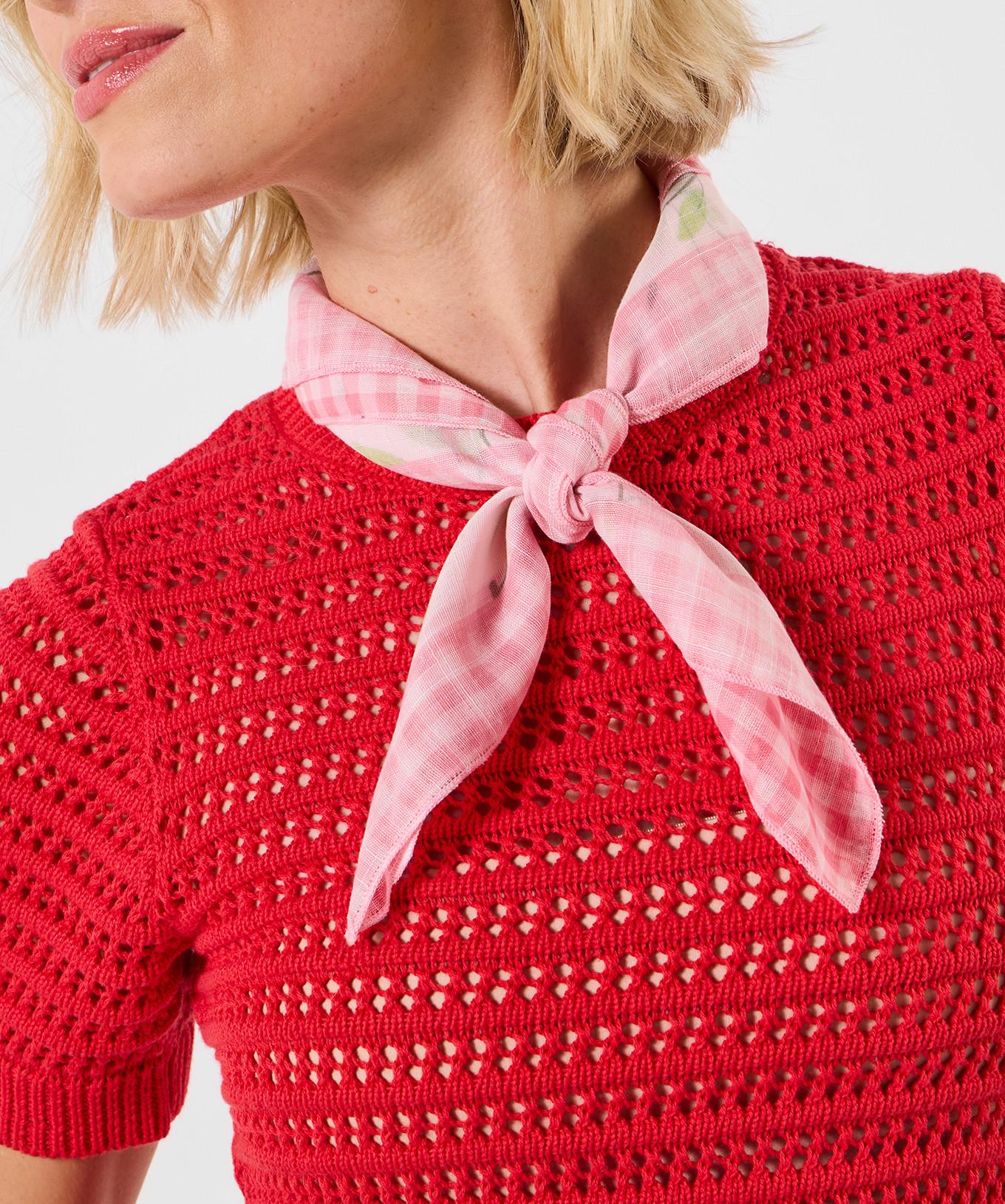 Dieses Halstuch mit Kirschmotiv setzt einen nostalgischen Akzent und ergänzt frühlingshafte Kombinationen.