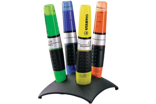 LUMINATOR - Textmarker Tischset Textmarker STABILO LUMINATOR Tischset. Art der Schreibflüssigkeit: Tinte auf Wasserbasis, lichtbeständig. Tintenspeicher-Technik: Liquid-Ink-System. Läuft unter Druck nicht aus, z.B. im Flugzeug, extra grosser Tintenvorrat, Füllstandsanzeige zur ständigen Kontrolle, gleichmässige Tintenabgabe, hohe Offenlagerfähigkeit, mehrfach preisgekröntes Design.