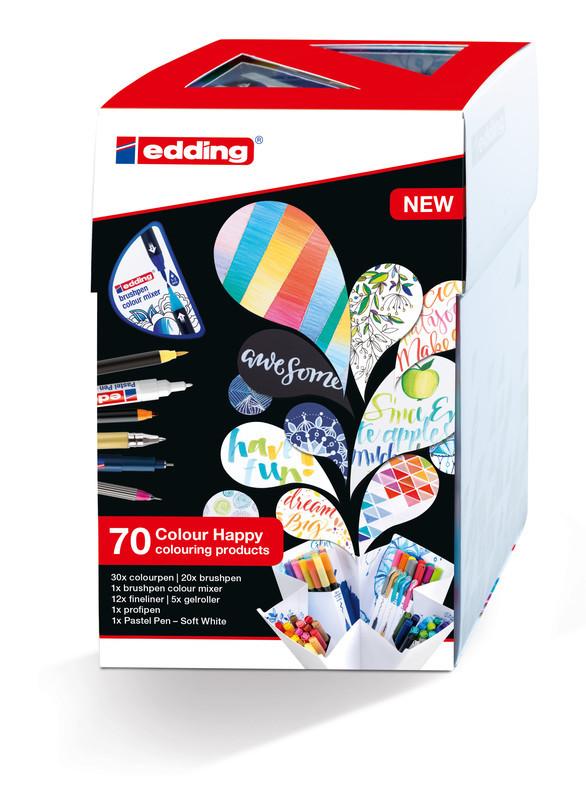 COLOUR HAPPY - Box Dekorativ ausgeschmückte Worte oder kleine Texte auf Grusskarten, Notizblöcken oder Wandbildern sind zur Zeit sehr angesagt. Das Trendthema heisst Handlettering. Bei dieser Kreativtechnik werden die Buchstaben kunstvoll gezeichnet und spielerisch ausgemalt - mit der colour happy box von edding haben sie das richtige Kreativwerkzeug dazu.
