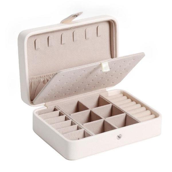 Diese praktische und stilvolle Schmuckschatulle bietet Platz für eine Vielzahl von Schmuckstücken. Das Design der Box eignet sich besonders zum Mitnehmen auf Reisen. Der untere Teil der Tasche enthält mehrere Fächer, die unter anderem für Ringe geeignet sind. Der obere Teil ist speziell zur Aufbewahrung von Halsketten angepasst. Dazwischen befindet sich ein Kissen zur Aufbewahrung von Ohrringen.
