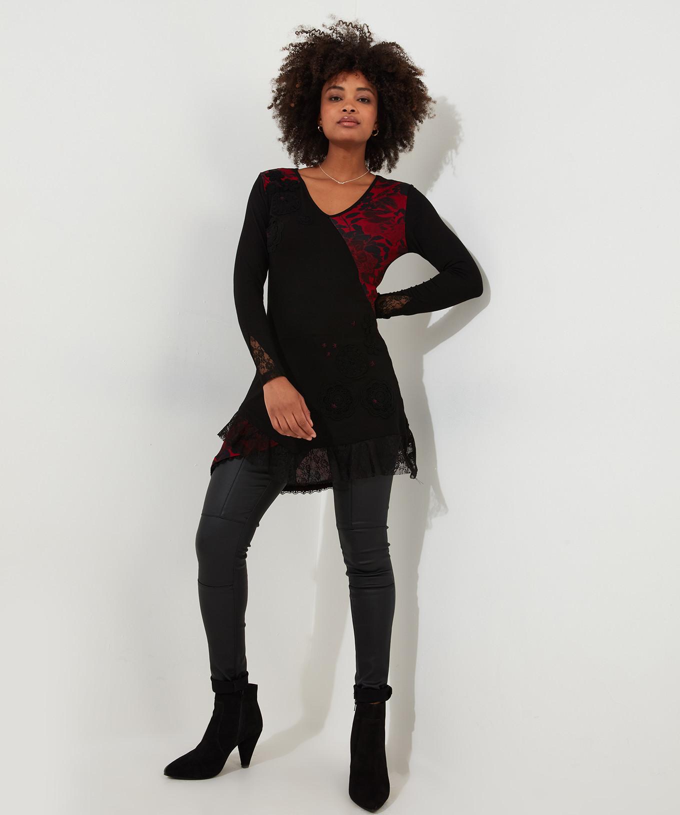 Diese Tunika präsentiert ein auffälliges Design mit einem bedruckten Muster, zarter Spitzenborte und eleganten Blumenapplikationen. Der V-Ausschnitt und die langen Ärmel tragen zu einer vielseitigen Silhouette bei, die sie für verschiedene Anlässe geeignet macht.
