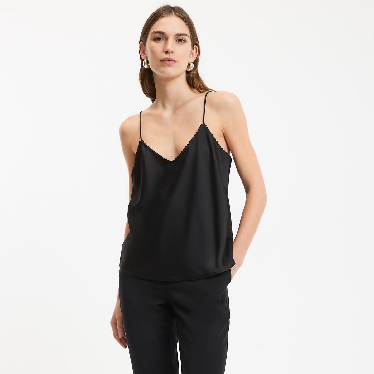 Dieses Satin-Top verfügt über einen V-Ausschnitt und zarte, schmale Träger, die einen raffinierten und eleganten Look bieten. Der glatte Stoff fällt wunderschön und macht es zu einem vielseitigen Kleidungsstück für verschiedene Anlässe.