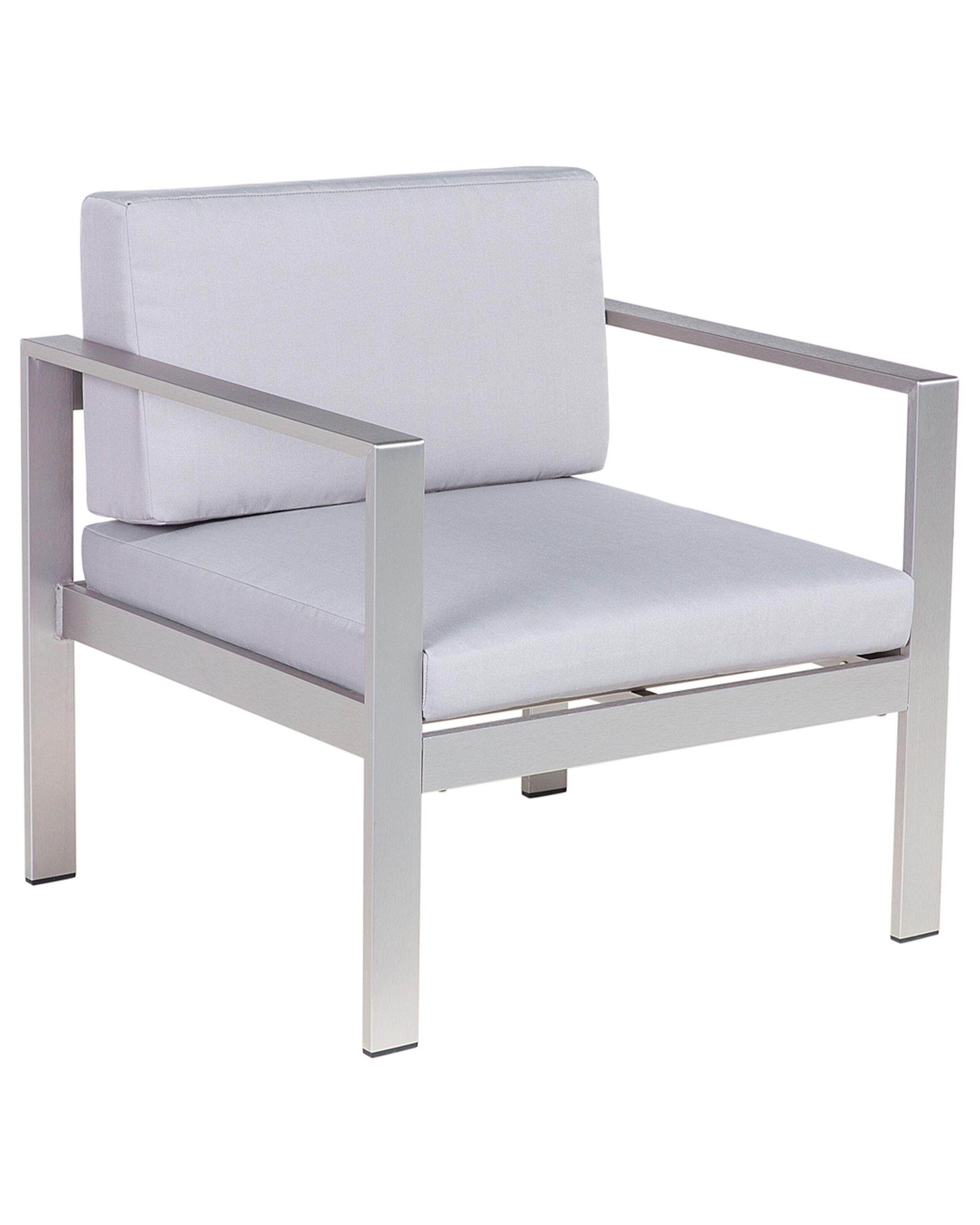 Moderner Sessel aus Aluminium mit Polstern in edlem Hellgrau. Dank der breiten und einladenden Form, den angenehm weichen Polstern und dem optimalen Sitzkomfort ist dieser Sessel ein bequemes Möbelstück für den Garten! Das stabile Gestell ist aus rostfreiem, eloxiertem Aluminium gefertigt und der Gartensessel ist mit bequemen Sitzpolstern und weichen Rückenkissen ausgestattet. Die hellgrauen Bezüge aus hochwertigem Polyester sind dank ihrer schmutz- und feuchtigkeitsabweisenden Beschichtung besonders pflegeleicht. Das witterungsbeständige und sehr pflegeleichte Material ist für den langfristigen Gebrauch im Freien konzipiert und wird Ihnen viele Jahre Freude bereiten.
