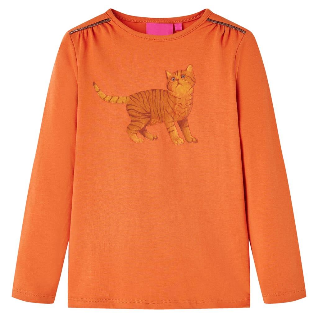 Dieses Kinder-T-Shirt hat lange Ärmel, einen Rundhalsausschnitt und eine gerade Passform. Dieses T-Shirt in Dunkelorange ist mit einem lieblichen Kätzchen bedruckt. Das Langarmshirt ist aus weichem Material gefertigt, das zu 95 % aus Baumwolle und zu 5 % aus Elastan besteht und daher nicht nur äußerst komfortabel, sondern auch atmungsaktiv ist.