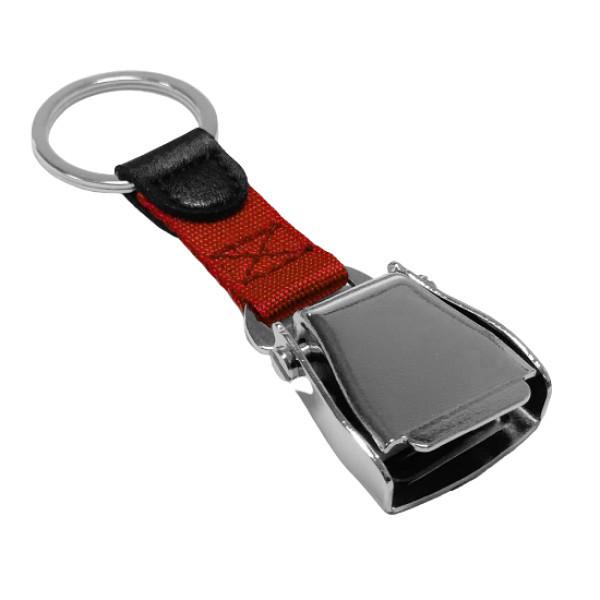 Kultiger und auffälliger Schlüsselanhänger in rot mit Mini Airline Seatbelt. Ebenso wie beim echten Flugzeugsitzgurt lässt sich der Anhänger von der Schnalle trennen. Die Schnalle wurde optisch und technisch am originalen Flugzeugsitzgurt nachgebaut.