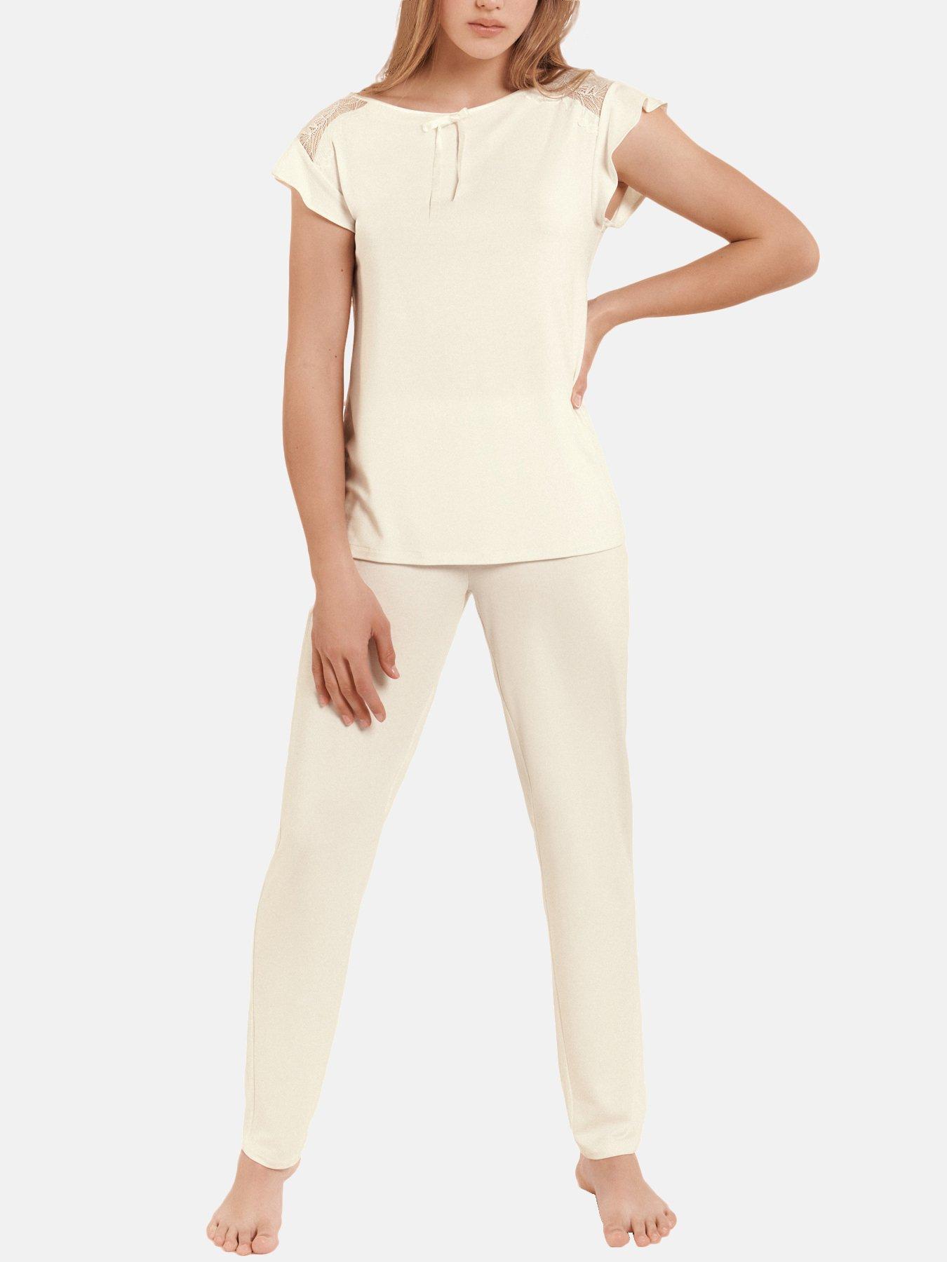 Dieses Pyjama-Set aus der Harvest Kollektion von Lisca bietet ein lässiges Design mit einem kurzärmeligen Oberteil aus weichem, bequemem Strick für ein angenehmes Tragegefühl. Die Schultern sind mit dekorativer Spitze verziert. Die bequeme Hose verfügt über einen elastischen Bund. Dieses zeitlose, romantische, bequeme und elegante Pyjama-Set ist aus angenehmer Wortex-Modal-Strickware in Kombination mit elastischer Spitze gefertigt.