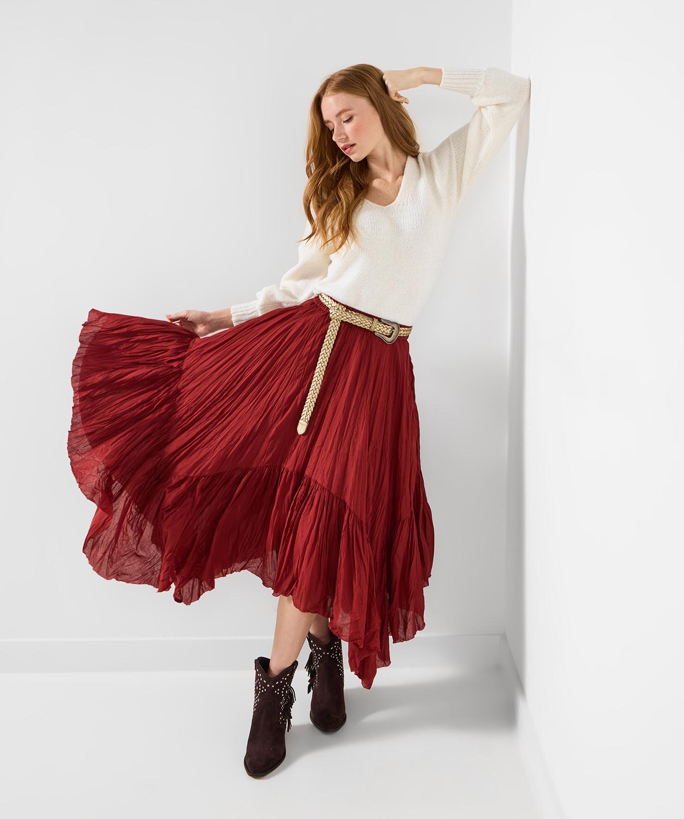 Dieser Maxirock verfügt über ein mehrlagiges Design und einen markanten Zipfelsaum, der eine fliessende und dynamische Silhouette bietet. Die Konstruktion des Rocks sorgt für eine bequeme Passform und ein stilvolles Erscheinungsbild, das für verschiedene Anlässe geeignet ist.