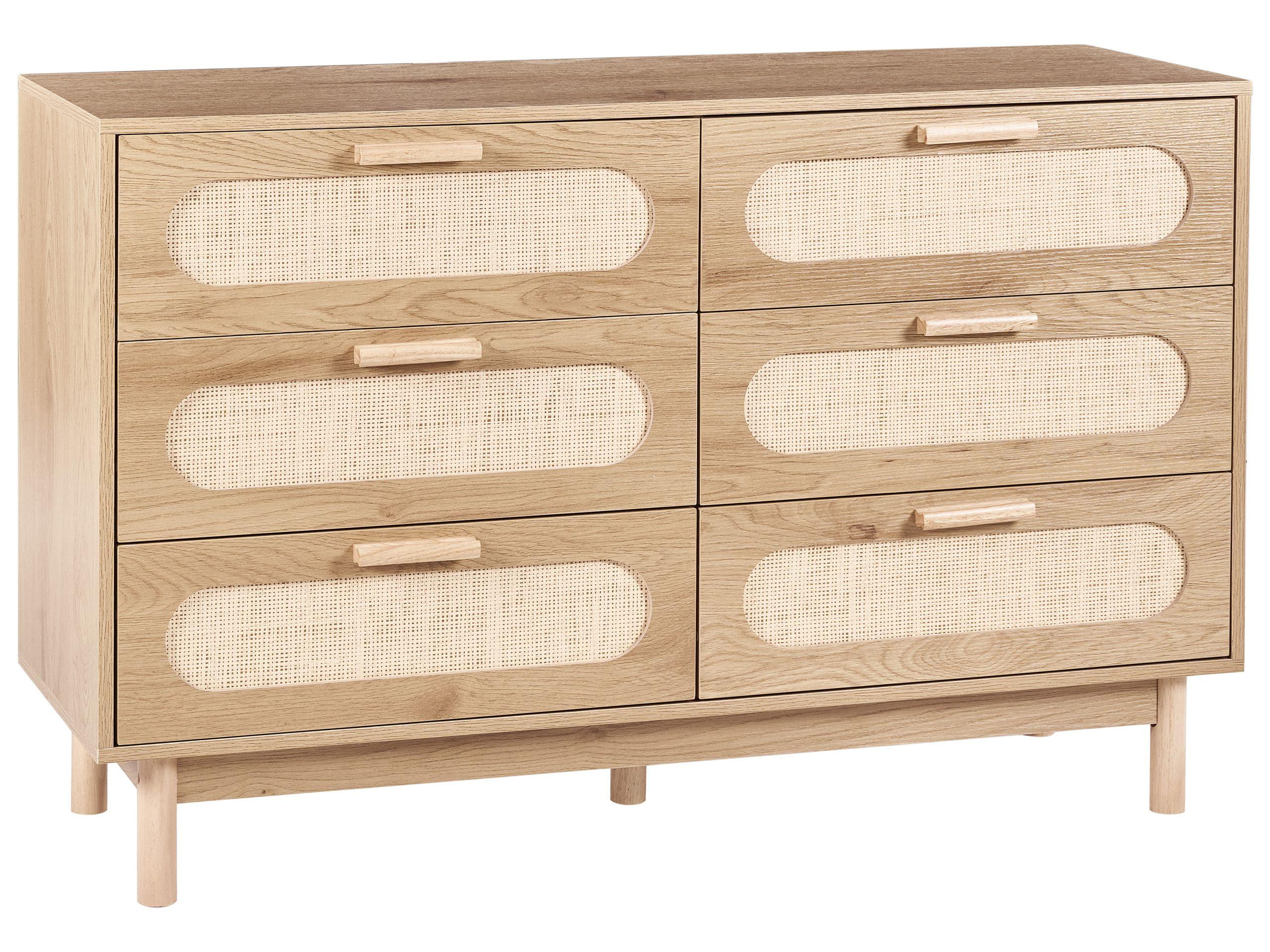 Kommode mit Vorderseite aus Rattan. Verleihen Sie Ihrem Zuhause mit dieser charmanten Kommode im Boho-Stil eine entspannte Atmosphäre. Sie besticht durch eine ästhetische Kombination aus hellbrauner Farbe und dekorativen Schubladenfronten aus Rattan, die sofort ins Auge fallen. Das Möbelstück ist aus hochwertigen Materialien gefertigt und verfügt über Beine aus massivem Gummibaumholz, die ihm eine natürliche Note verleihen. Es bietet mit seinen sechs geräumigen Schubladen reichlich Stauraum, um Ihre persönlichen Gegenstände ordentlich zu verstauen – egal, ob im Schlaf- oder Wohnzimmer.