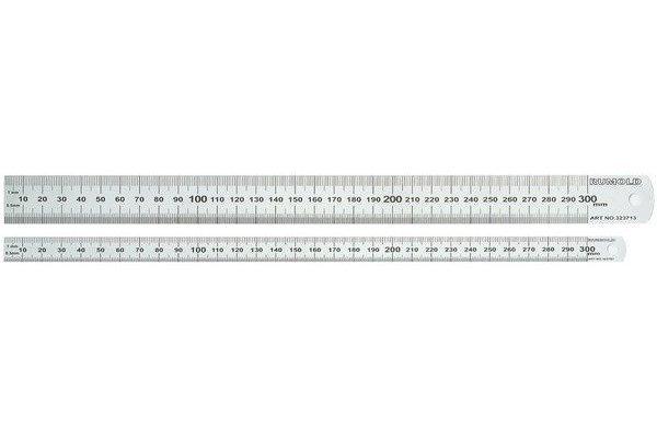 Stahllineale Das handliche Lineal aus rostfreiem Edelstahl hat eine mm- und ½mm-Teilung und den Nullpunkt an der Außenkante. Zudem hat es ein Aufhängeloch. Material: rostfreier Edelstahl Mit Aufhängeloch