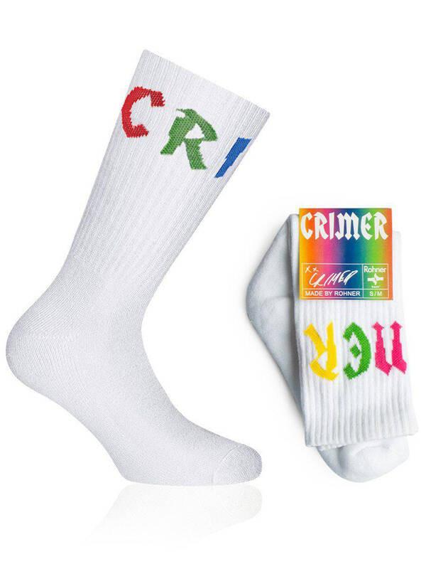 Diese Sportsocken präsentieren sich in einem klassischen Design mit einem gerippten Bündchen für einen sicheren Halt. Die weisse Basis wird durch farbenfrohe 'CRIMER'-Schriftzüge akzentuiert, die der Sportbekleidung eine lebendige Note verleihen. Diese Kollektion wurde in Zusammenarbeit mit ROHNER SOCKS lanciert und produziert.