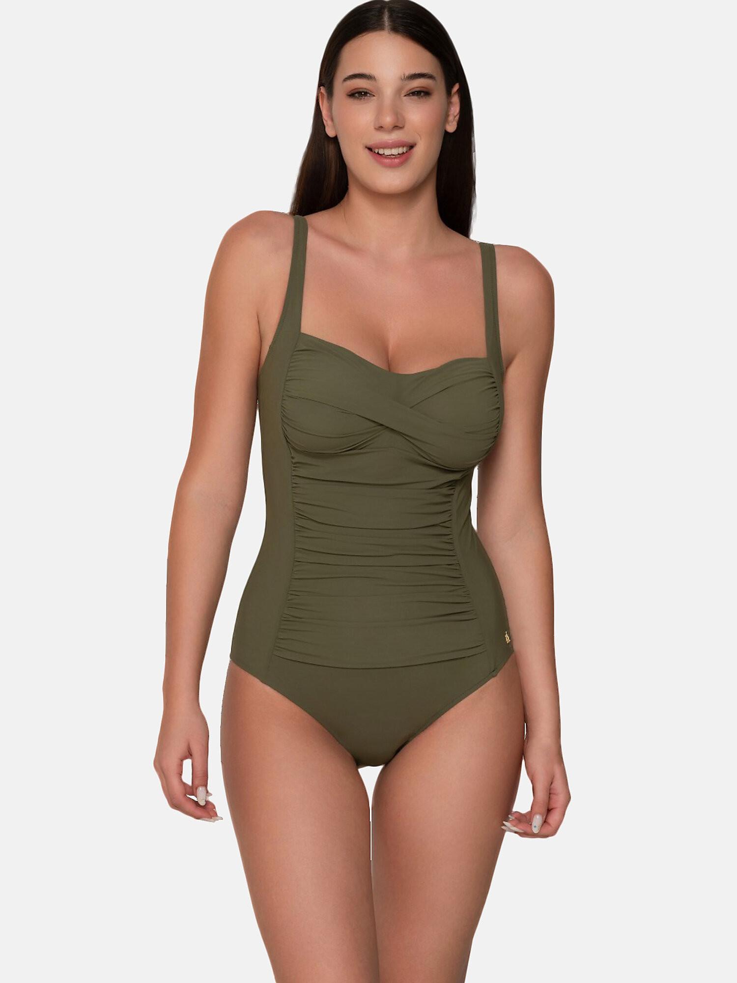 Dieser elegante und glamouröse vorgeformte Shapewear-Badeanzug verfeinert die Silhouette durch sein ausgeklügeltes Spiel mit sorgfältig drapierten Falten. Die Raffung vorne und die eingearbeiteten Softcups sorgen für eine grandiose Silhouette. Die verstellbaren Träger und der Rückenausschnitt vervollständigen den eleganten Stil dieses Teils, das dank seines hochwertigen Materialmixes äußerst bequem ist.