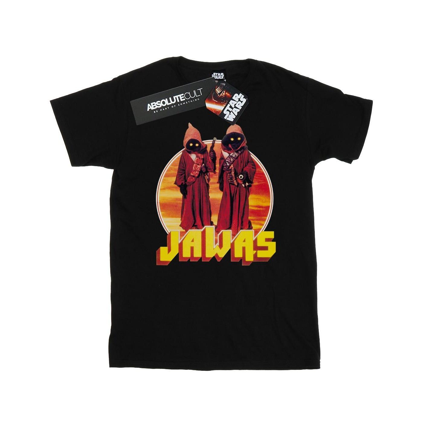 Dieses T-Shirt verfügt über einen klassischen Rundhalsausschnitt und kurze Ärmel, die eine bequeme und vielseitige Passform bieten. Die Vorderseite des Shirts zeigt einen lebendigen Grafikdruck der Jawas aus Star Wars: A New Hope, vor einem kreisförmigen Sonnenuntergangshintergrund mit dem Wort „JAWAS“ prominent darunter.