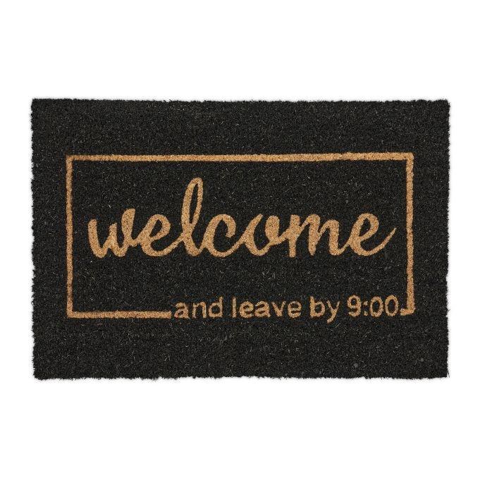 Verschönern Sie Ihren Eingangsbereich mit einer robusten Fußmatte aus langlebigen Kokosfasern mit dem humorvollen „Willkommen und bis 21:00 Uhr gehen“-Aufdruck. Diese Fußmatte hält Schmutz fern und verleiht Ihrer Türschwelle gleichzeitig Charme.