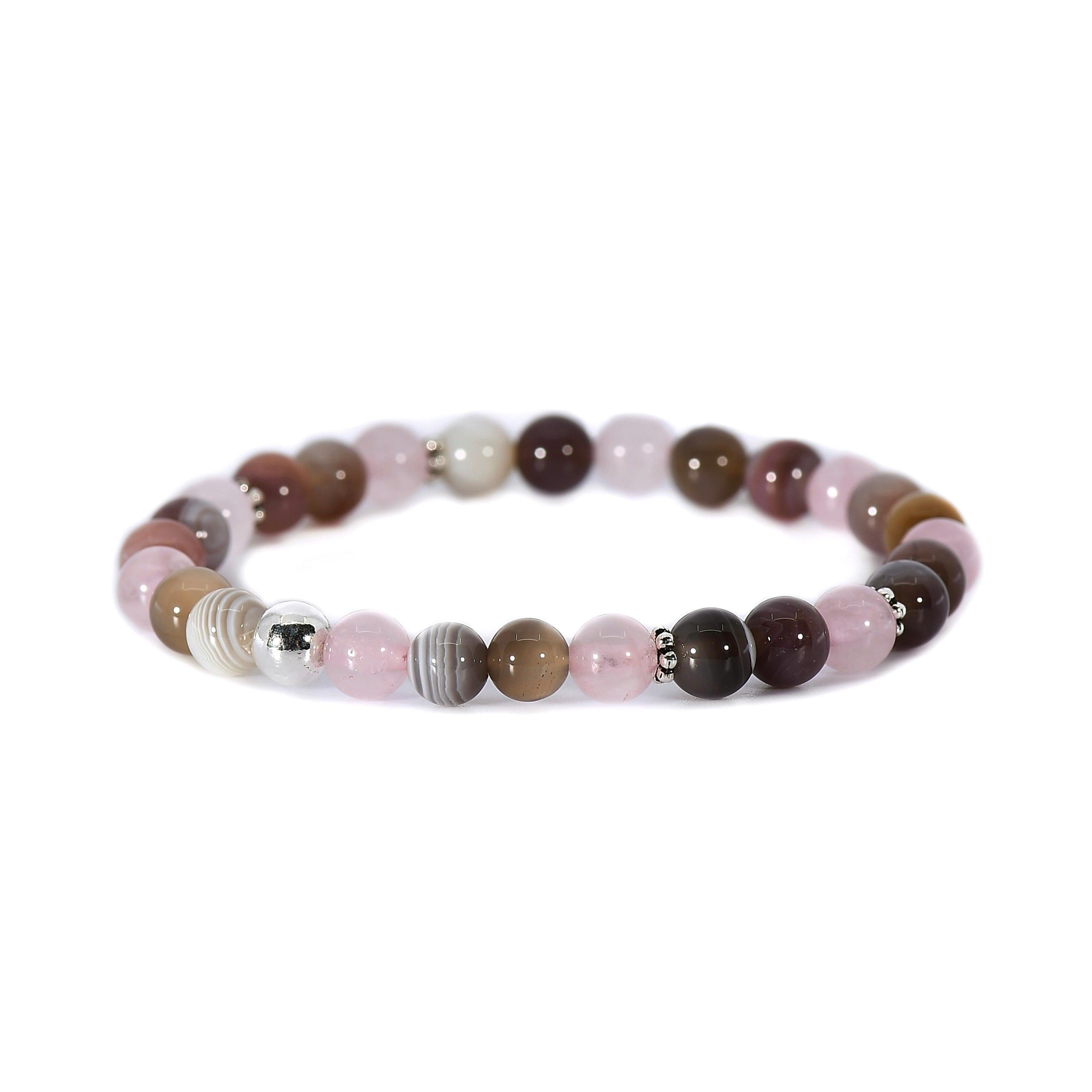 Dieses liebevoll gestaltete Damenarmband vereint 6mm grosse Achat- und Rosenquarz-Steine zu einer harmonischen Komposition aus sanften Naturtönen. Die sorgfältig aufeinander abgestimmten Farben schaffen ein ausgewogenes Gesamtbild und verleihen dem Armband eine ruhige, feminine Ausstrahlung.