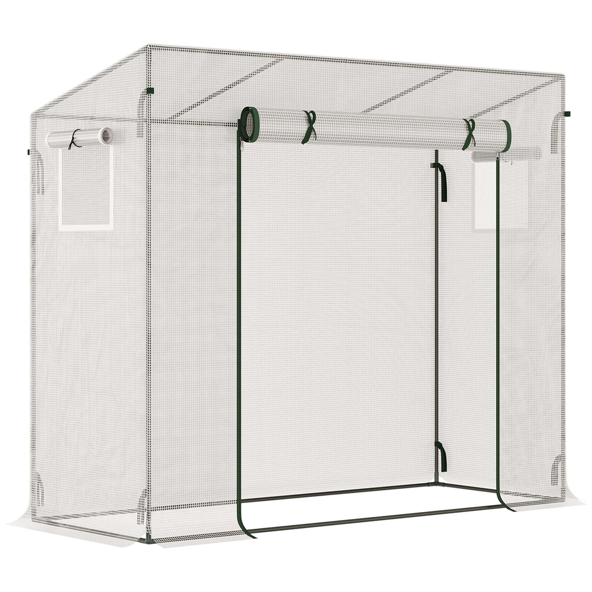 Ob im Frühjahr oder im Spätherbst - mit diesem kompakten Anlehngewächshaus von Outsunny können Sie Ihre Pflanzen unter den besten Bedingungen hochziehen. Das Gewächshaus ist mit einem robusten Stahlrahmen ausgestattet und das im Lieferumfang enthaltene Zubehör sorgt für zusätzliche Stabilität. Die Kunststoffplane schützt vor Wind, Regen und Tieren und speichert die Wärme. Ausgestattet mit einer aufrollbaren Tür, um jederzeit bequem an Ihre Pflanzen gelangen zu können.