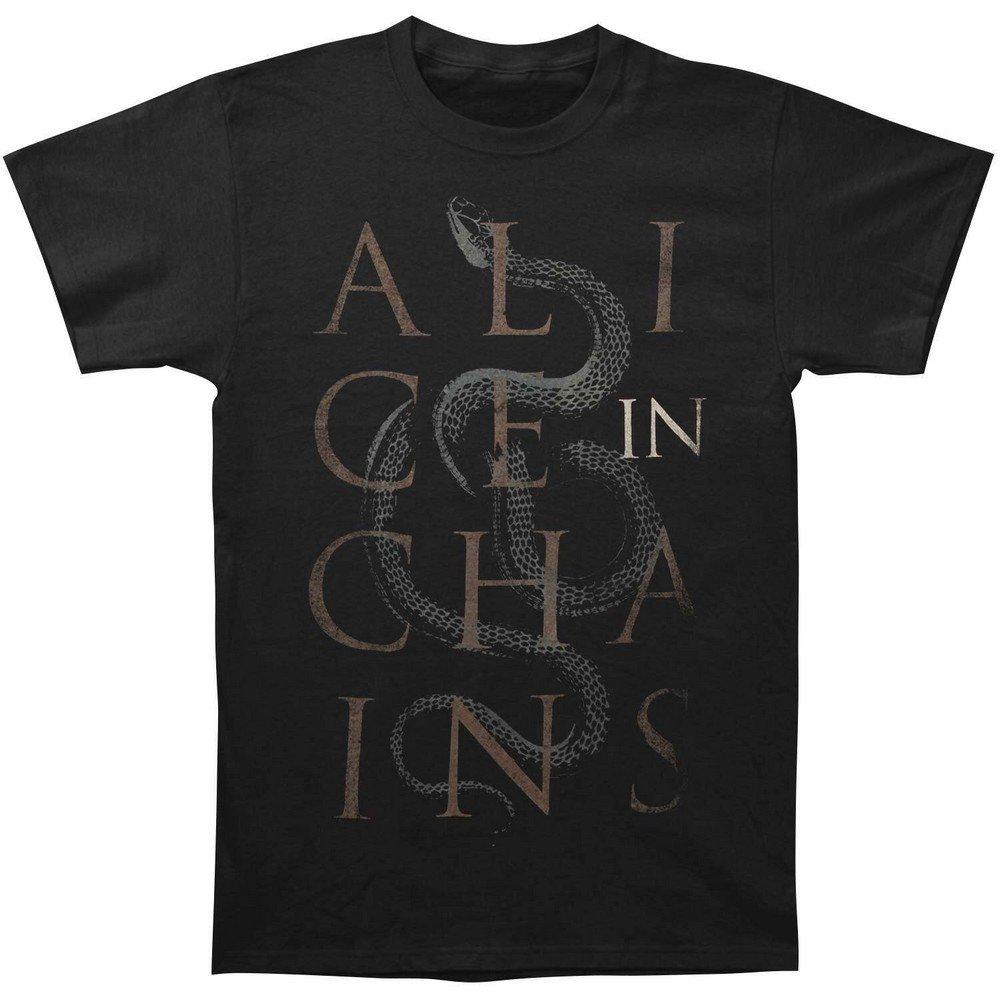 Dieses T-Shirt zeigt einen auffälligen Grafikdruck des Bandnamens „Alice in Chains“, der sich mit einem detaillierten Schlangendesign verschlingt. Der klassische Rundhalsausschnitt und die kurzen Ärmel machen es zu einer vielseitigen Ergänzung für jede Garderobe.