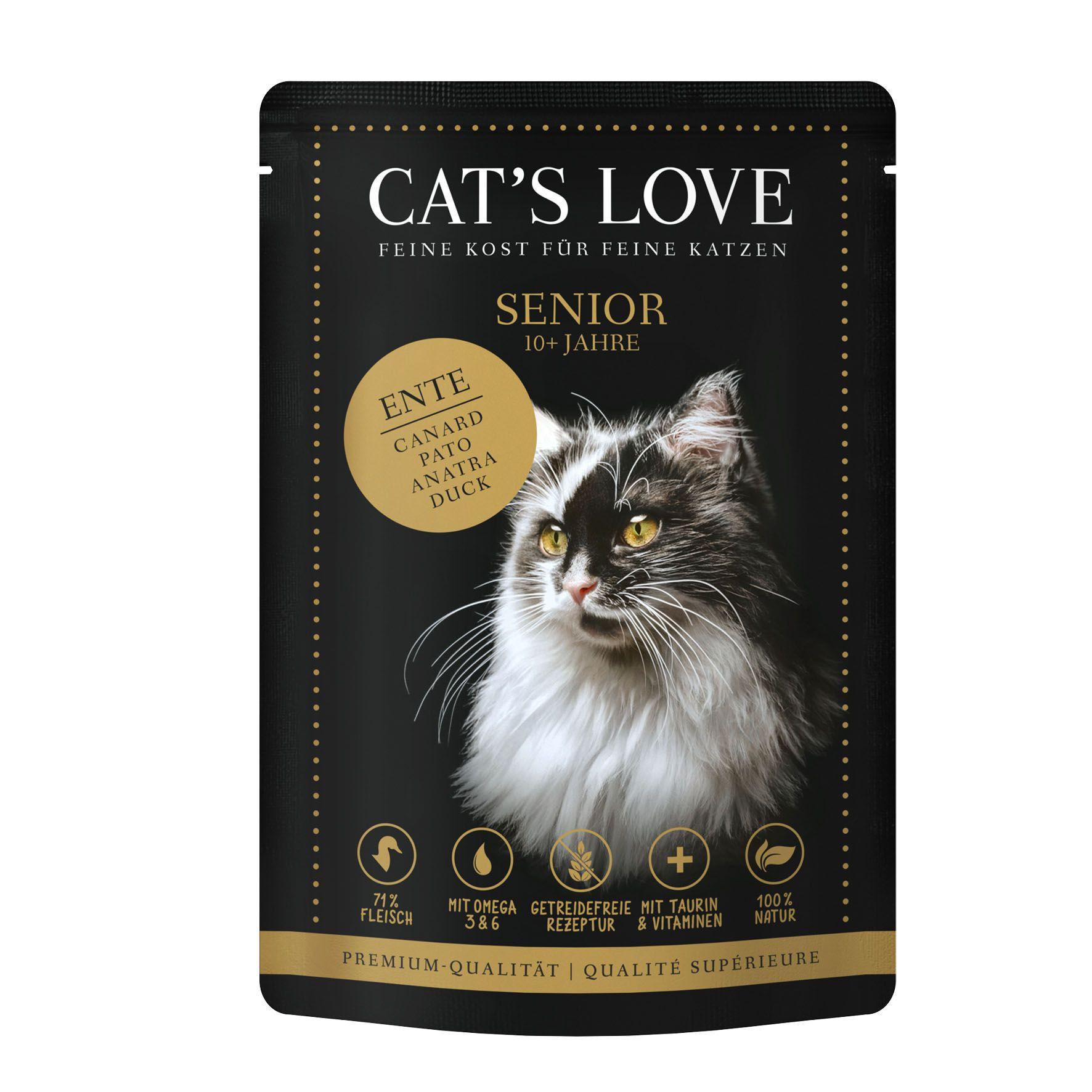 Cat's Love Senior 10+ Ente 10x85g Egal, ob es sich um einen Tiger, einen Mäusejäger oder einen Stubenhocker handelt, Ihre Katze verdient eine artgerechte Ernährung, die es ihr ermöglicht, ein langes und gesundes Leben an Ihrer Seite zu führen. Genau das bieten wir Ihnen mit unserer fein abgestimmten Vollwertkost von CAT'S LOVE. Mit einem hohen Fleisch- oder Fischanteil versorgt jede von Tierärzten entwickelte Sorte Ihre Katze mit genau den Nährstoffen, die sie wirklich braucht. Und weil die Natur immer das Beste bietet, setzen wir auf rein natürliche Zutaten ganz ohne Zuckerzusatz oder chemische Zusätze. Mit CAT'S LOVE entscheiden Sie sich für eine artgerechte getreidefreie Ernährung, die Ihrem Liebling den vollen Geschmack der Natur verleiht.
