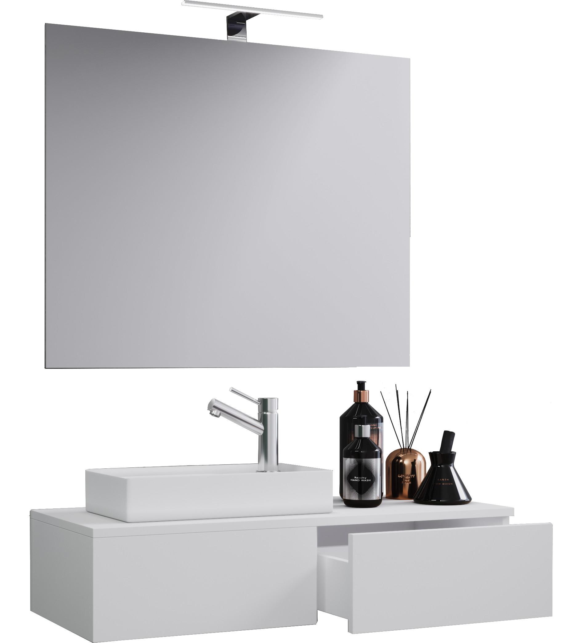 Das Set besteht aus einem Spiegel und einem Waschbecken mit Waschbeckenunterschrank. Eine sehr elegante Einrichtungslösung für WCs oder Gästetoiletten, um ein optisches Highlight zu setzen.
