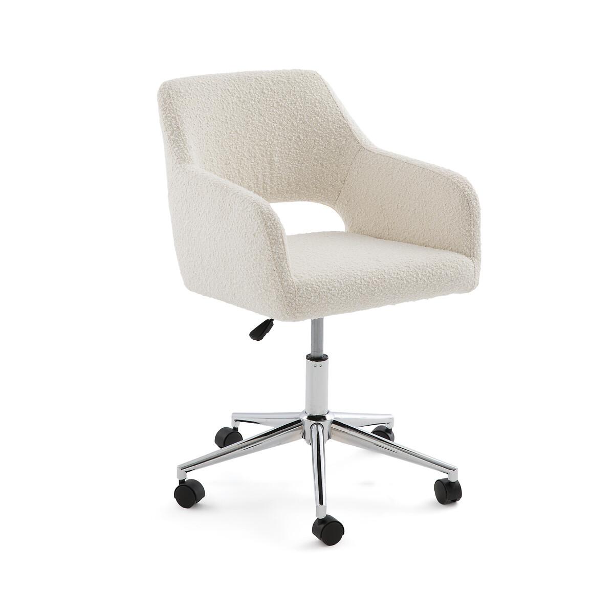Modernes Design und Bouclé-Bezug. Dreh- und höhenverstellbarer Sitz. Fussteil aus verchromtem Stahl. Das sind die Vorzüge des Schreibtischsessels Esma. Wenn man so bequem sitzt, arbeitet es sich noch einmal so gut...