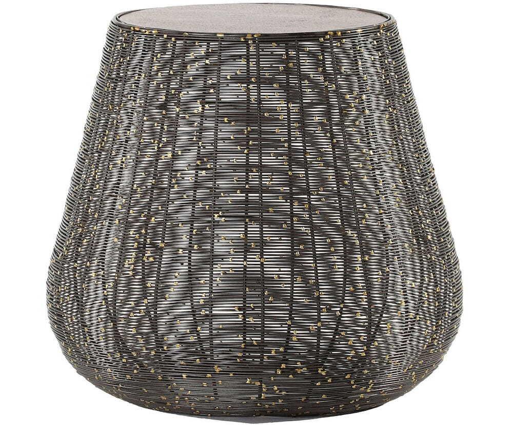 Struktur aus pulverbeschichtetem Eisen in schwarzer Farbe mit goldfarbenen Akzenten. Runde Tischplatte aus Aluminium in der Farbe Messing antik. Max. Belastbarkeit : 20 kg